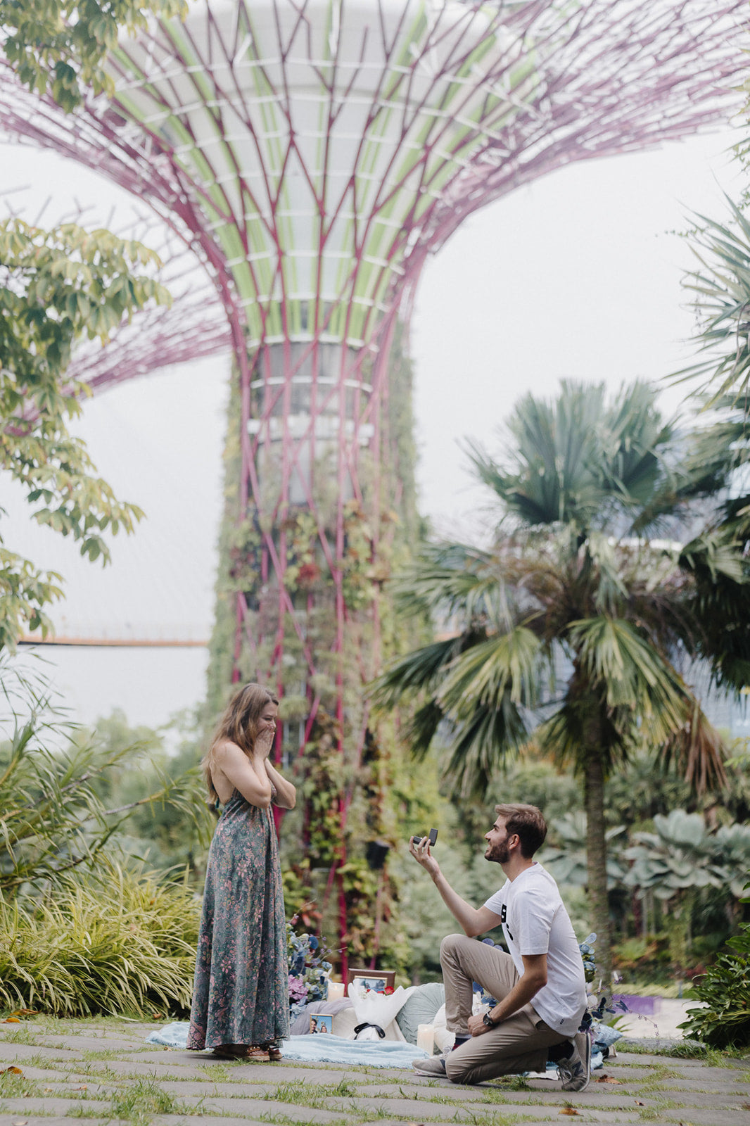 Plan a surprise picnic amidst the Supertrees Grove. Set up a cozy blanket, pillows, and beautiful flower arrangement under the shade of the towering trees. Express your love and commitment with a heartfelt proposal while enjoying delicious snacks and refreshing drinks surrounded by nature's beauty.
