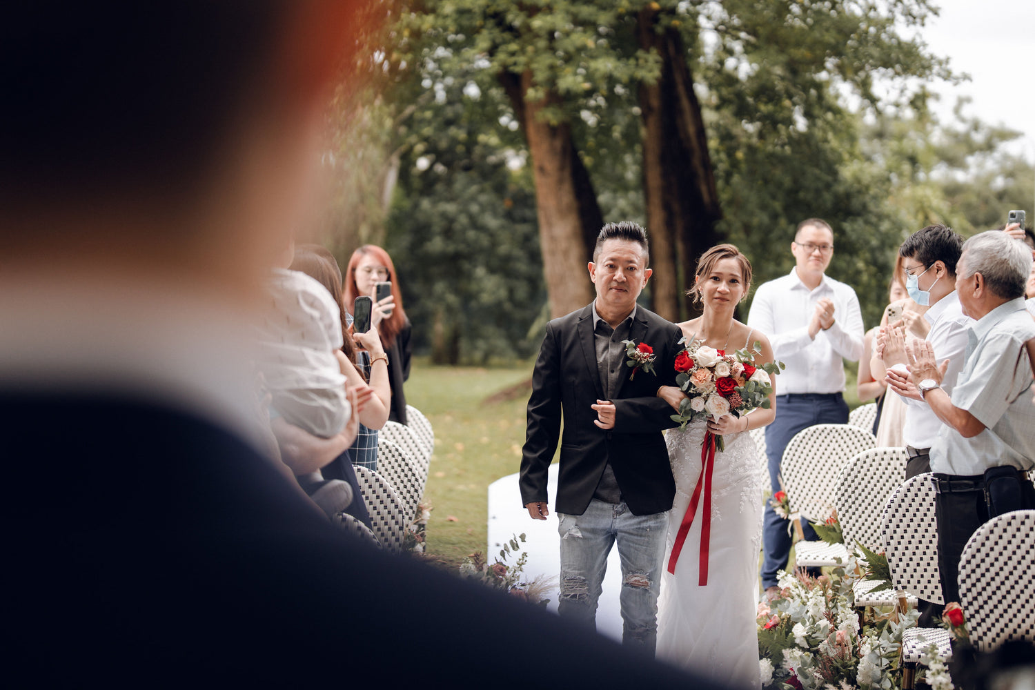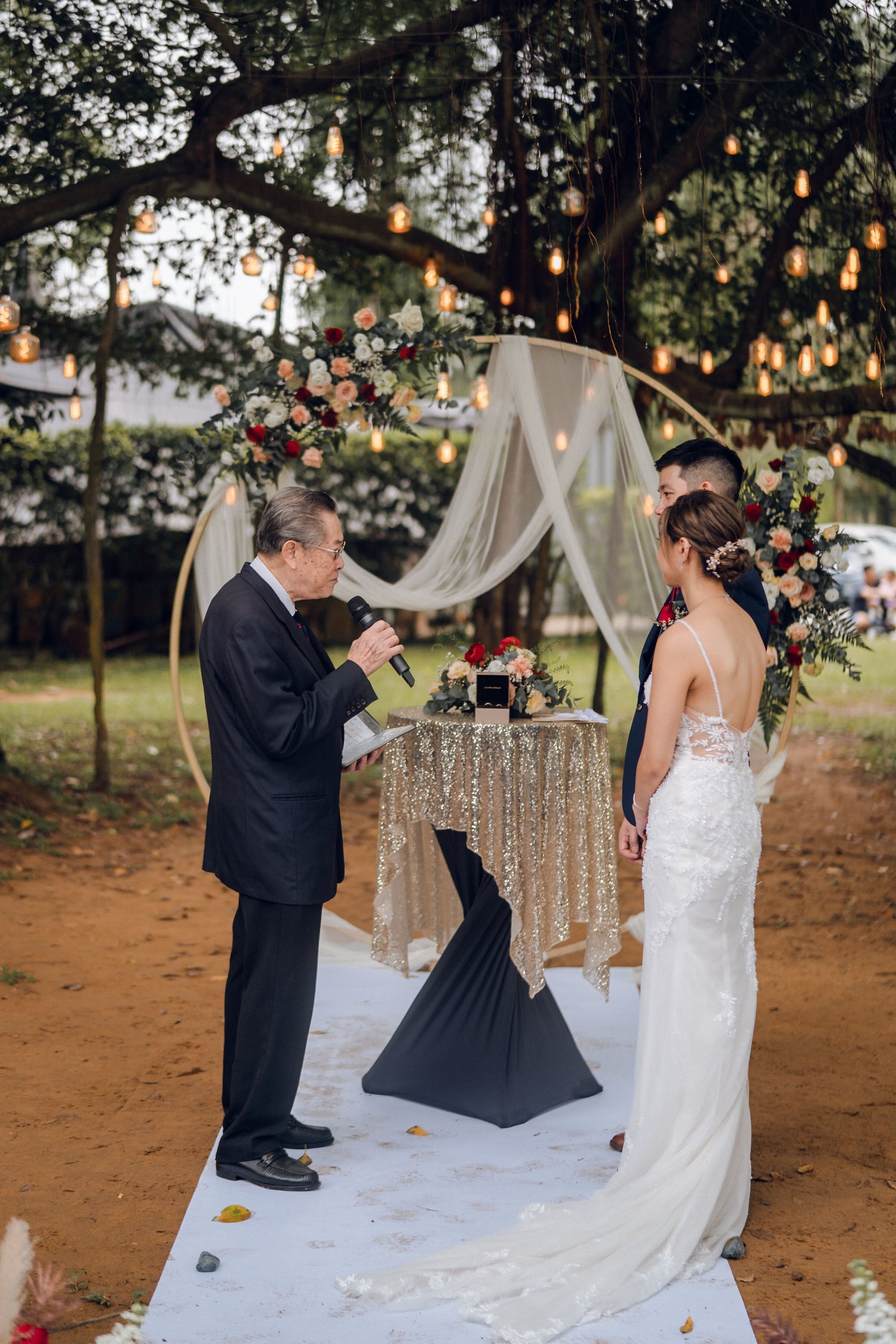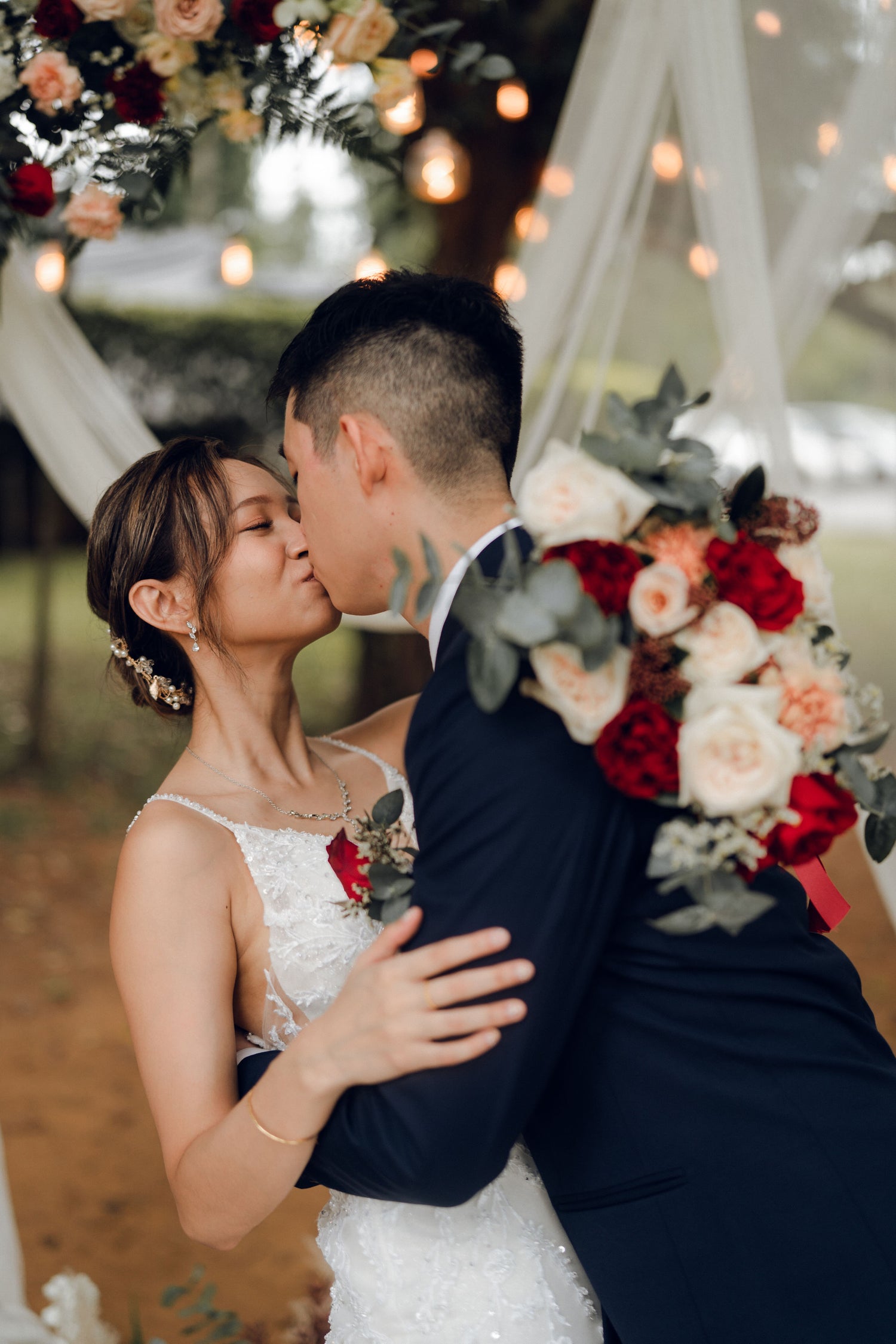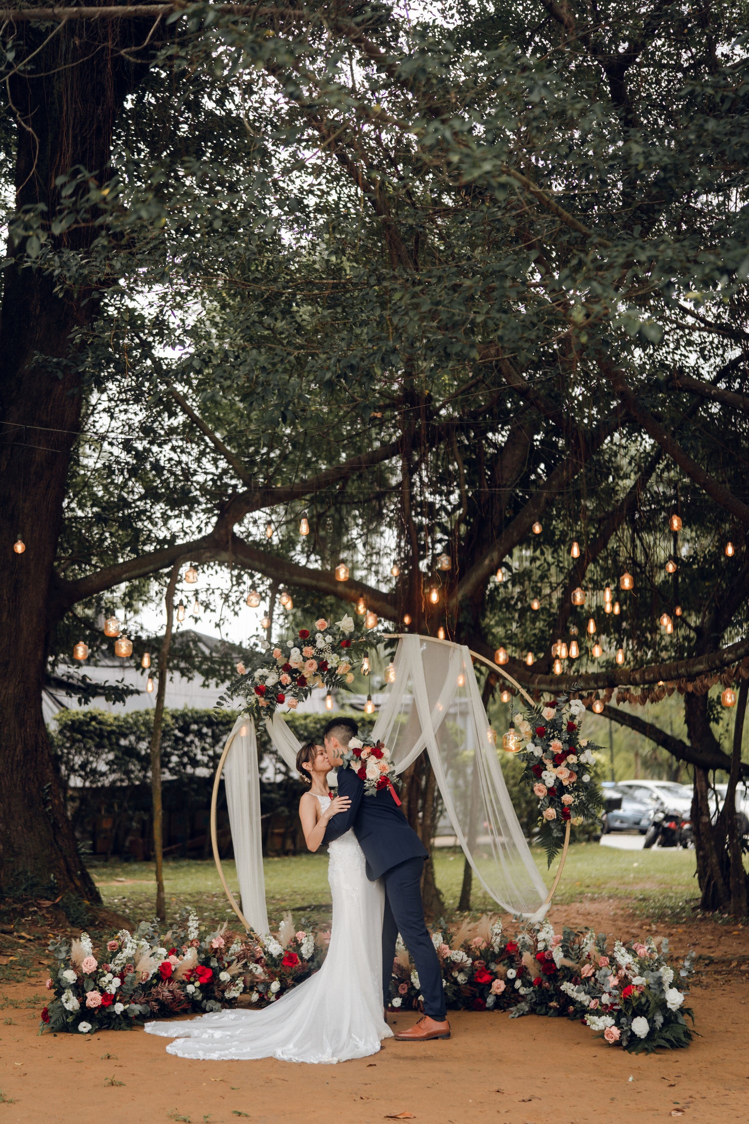 Y & E's wedding was a picturesque moment, embracing the charm of a rustic outdoor setting while incorporating a classic theme highlighted by lush greenery. The color palette of deep reds, soft pinks, and pristine whites added an elegant touch to the natural surroundings.