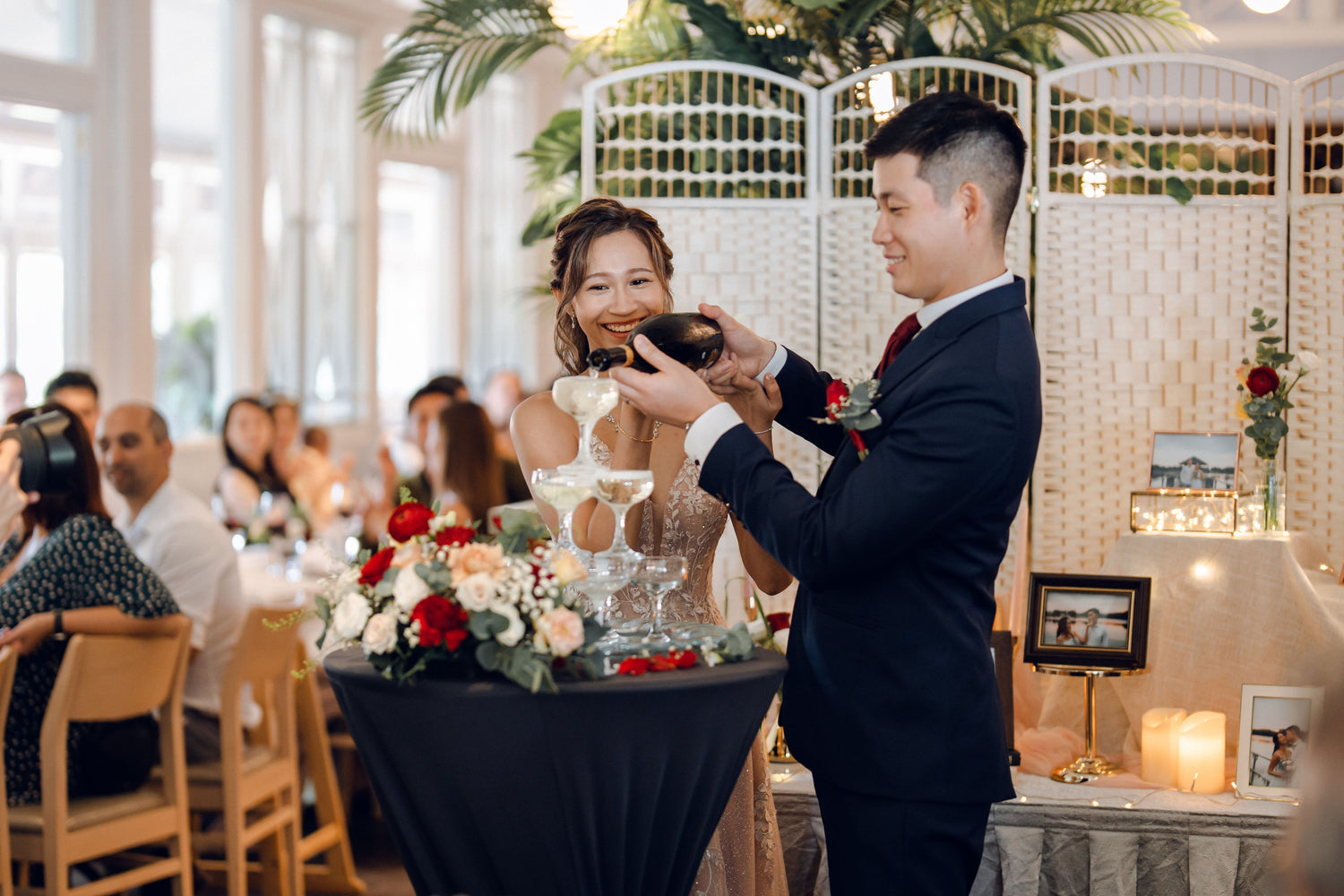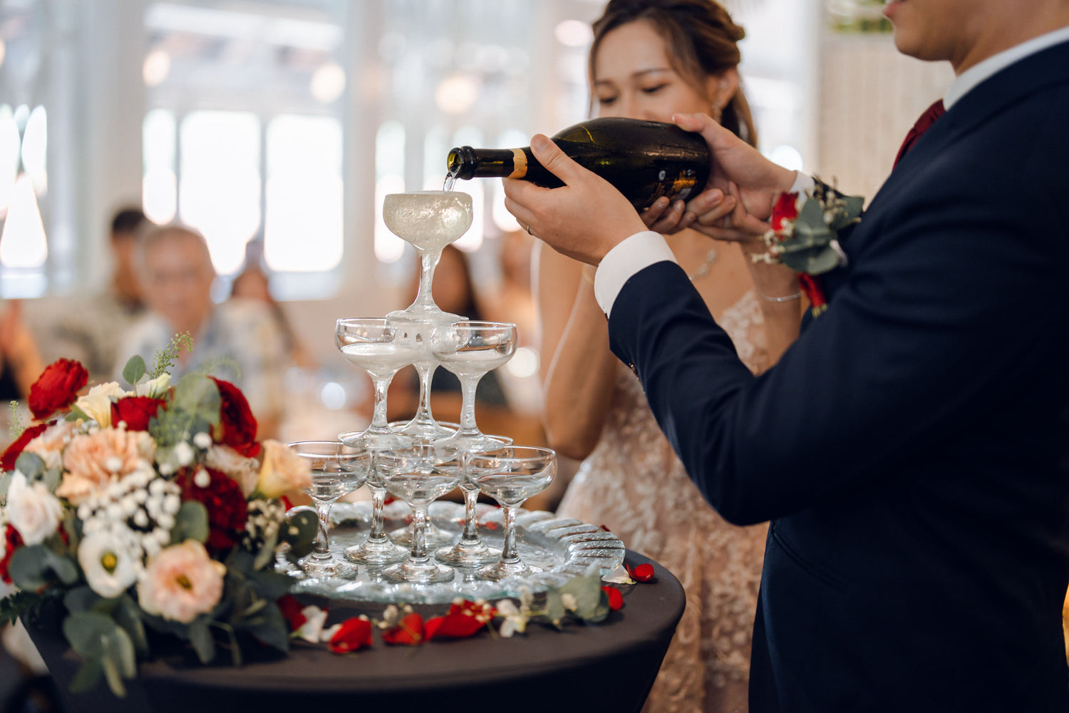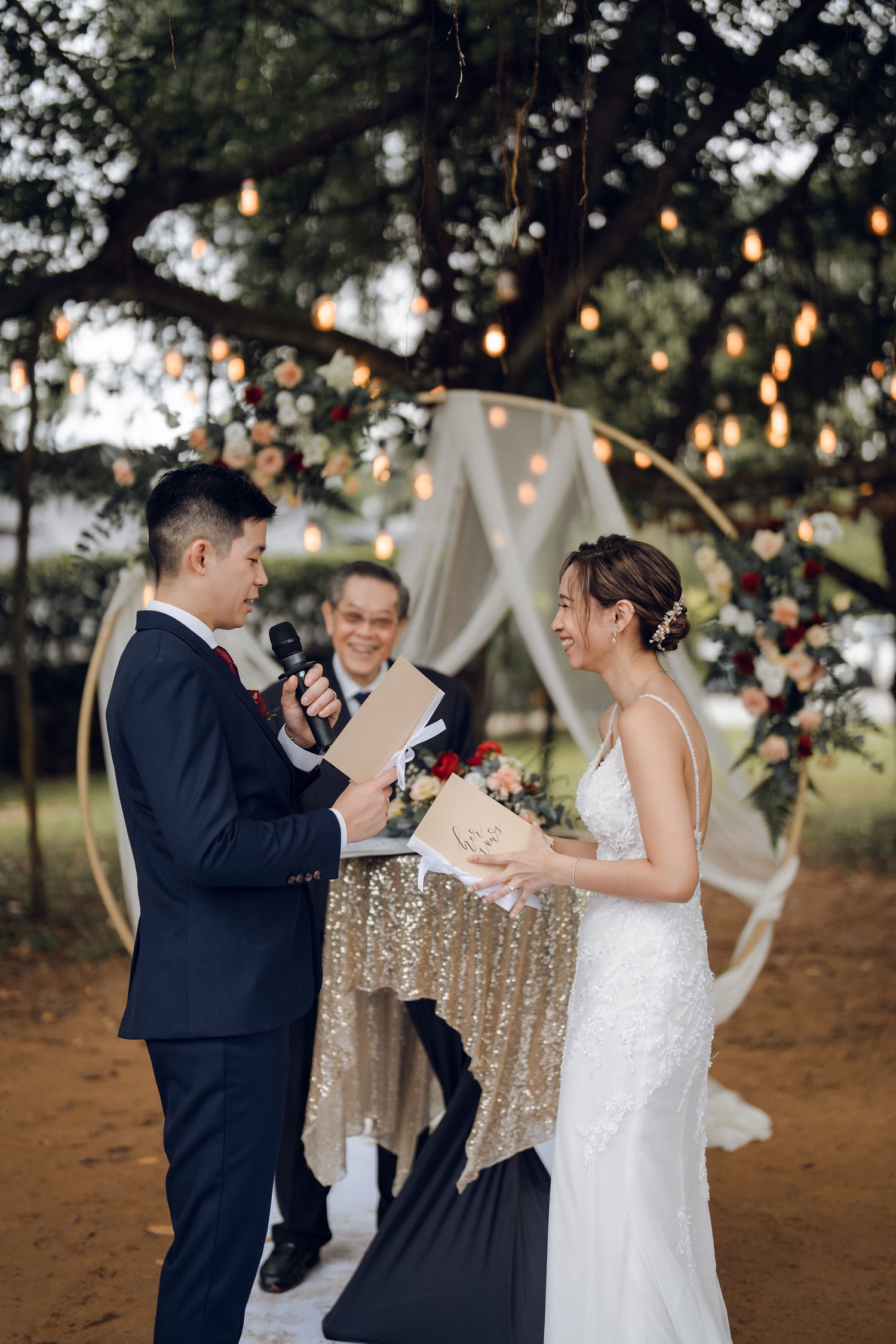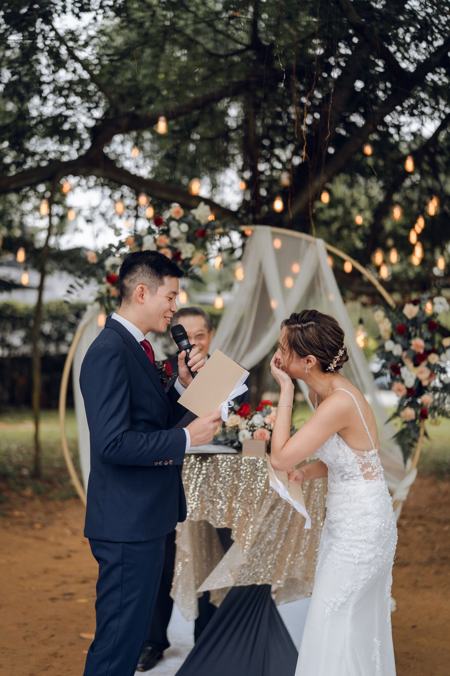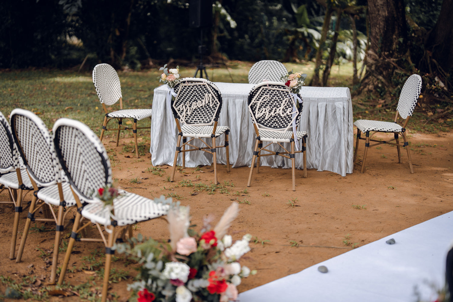 Y & E's wedding was a picturesque moment, embracing the charm of a rustic outdoor setting while incorporating a classic theme highlighted by lush greenery. The color palette of deep reds, soft pinks, and pristine whites added an elegant touch to the natural surroundings.