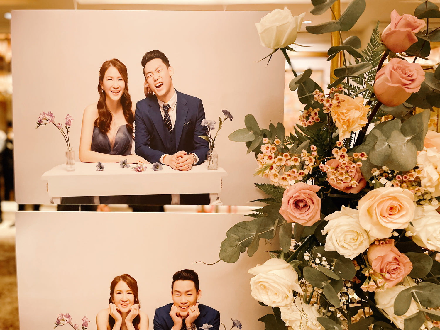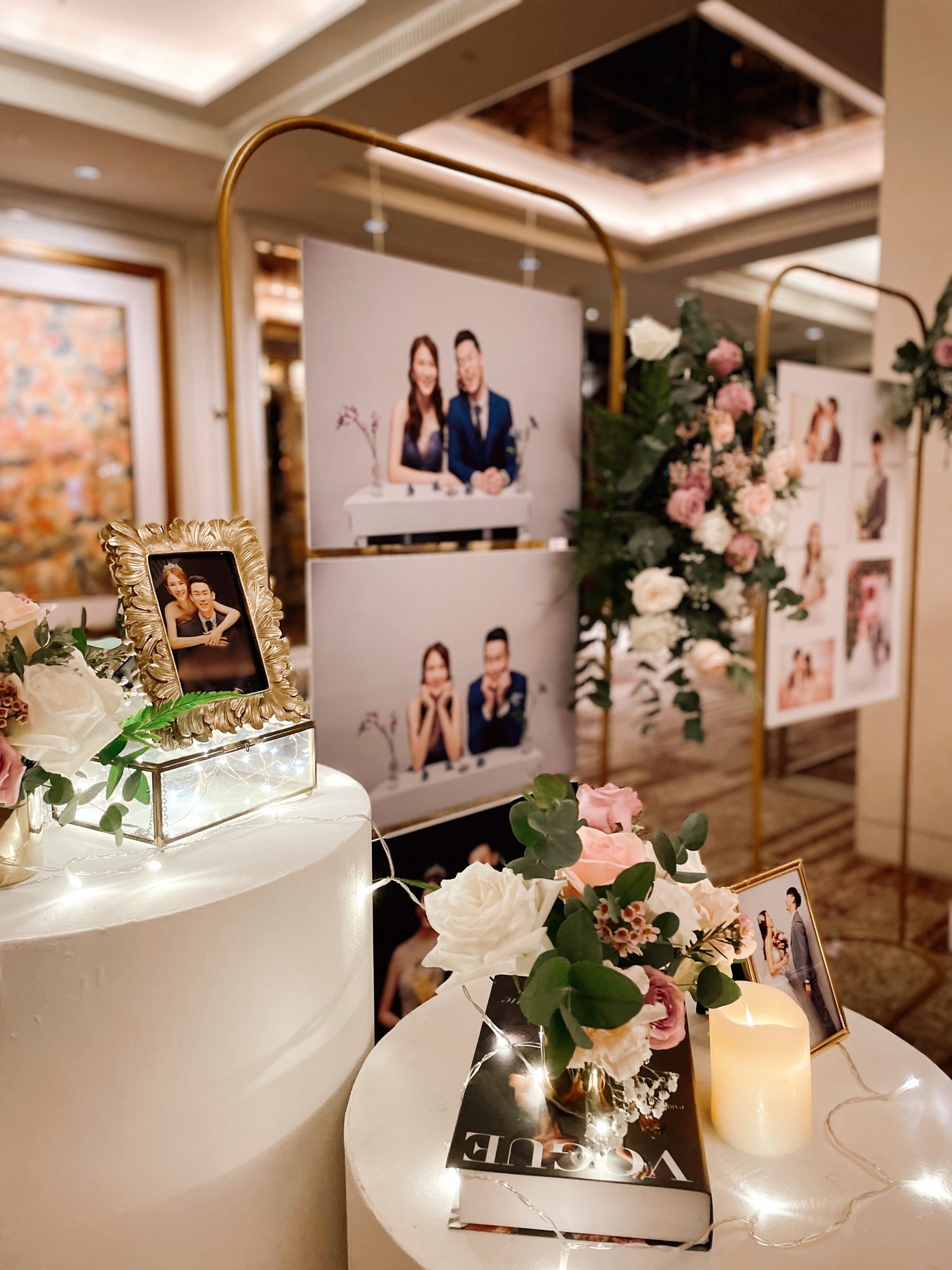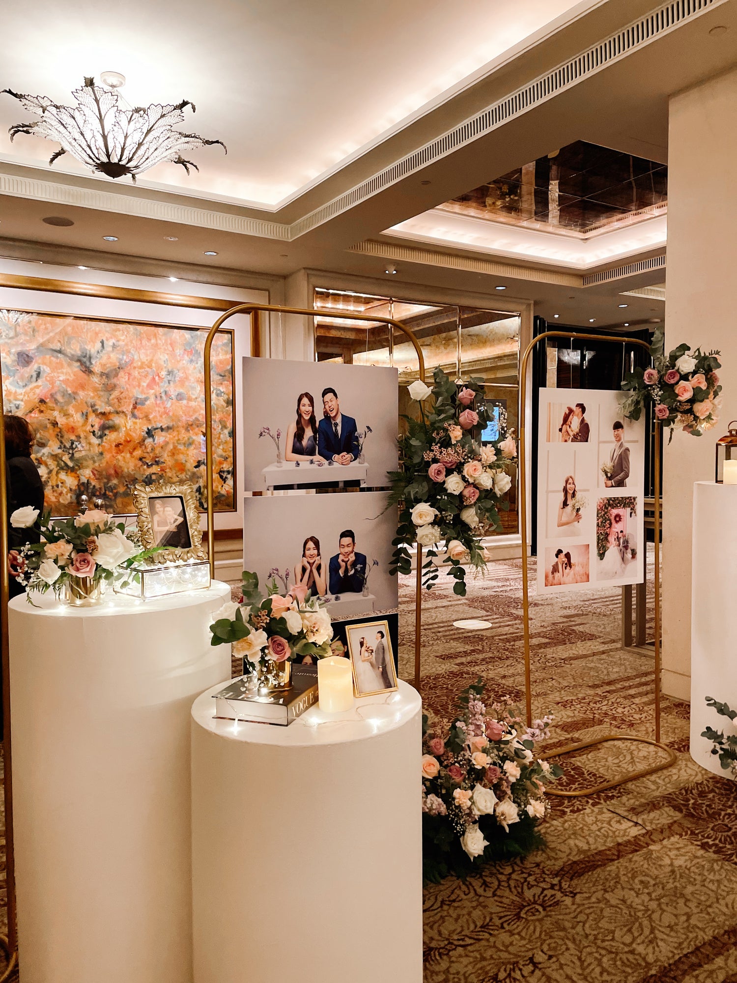 An elegant take on D & R's pre-wedding photos in a gold tinted gallery-style display. Pastel mauve floral blooms against the exquisite St. Regis ballroom decor is definitely a picture-perfect moment.
