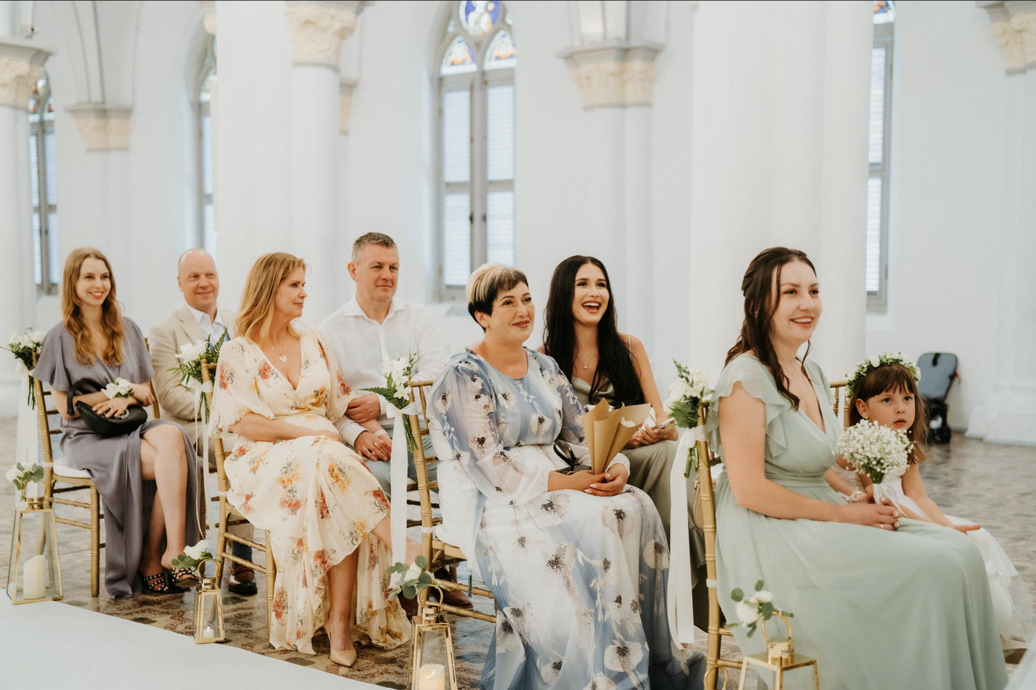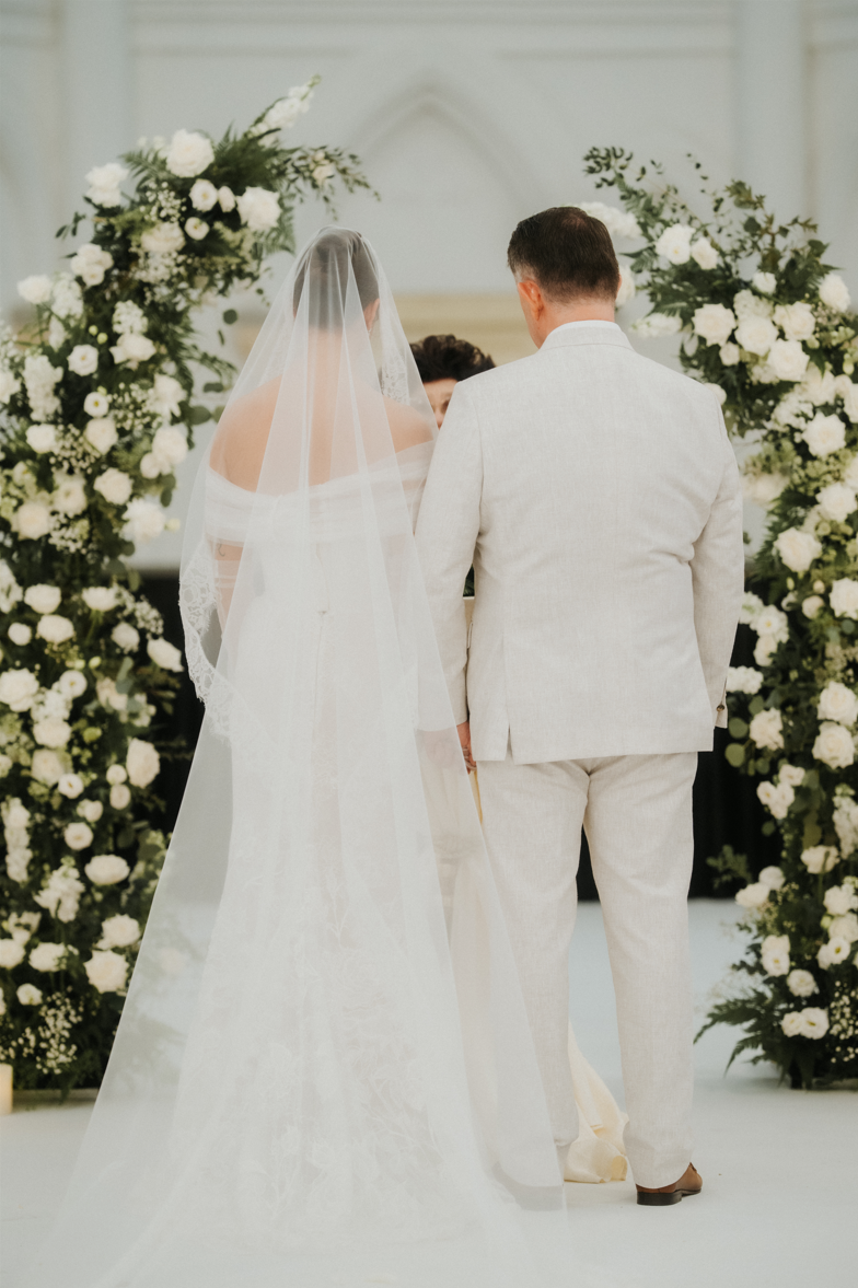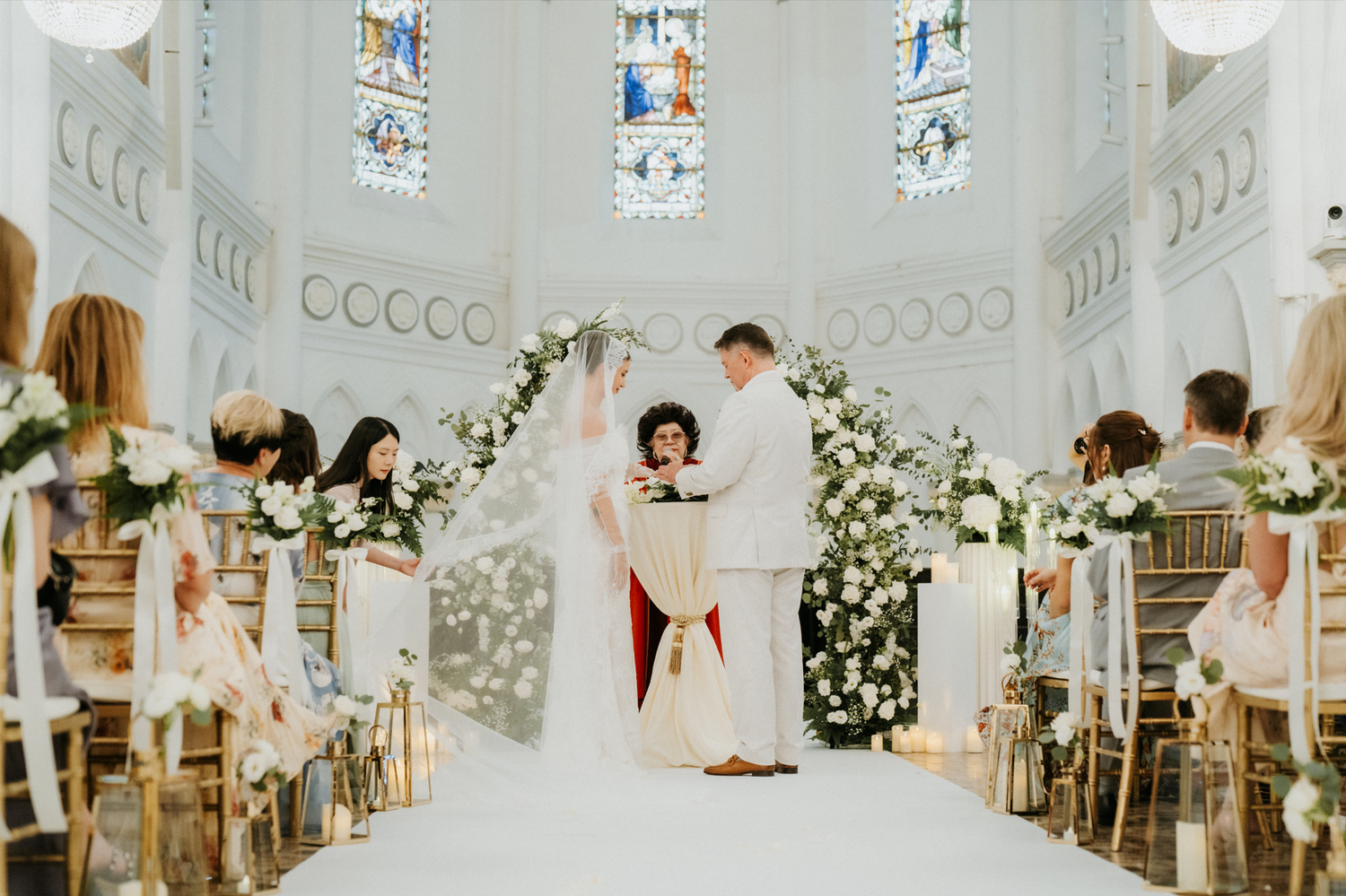 Elegantly styled in a timeless colour palette of green and white, this beautiful wedding ceremony was held at CHIJMES Hall Singapore. Coupled with a long white aisle carpet for the perfect march-in moment.