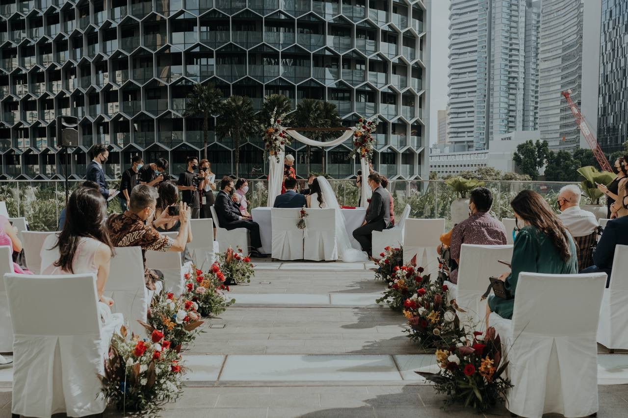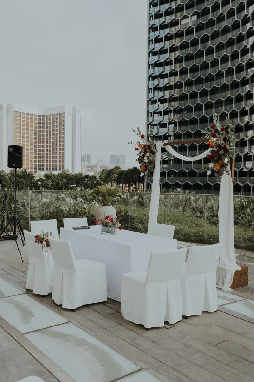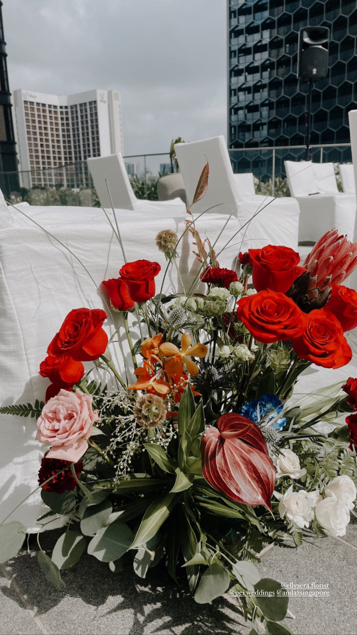 Beautiful view with on a breezy Boxing Day last December. Wedding celebration of M&H at Andaz Singapore in a vibrant floral palette of reds, orange and blue. We styled this spacious outdoor balcony with lush aisle floral installations & a rustic wedding arch for solemnisation - which were all repurposed into the Glasshouse for the intimate lunch reception to celebrate our couple.