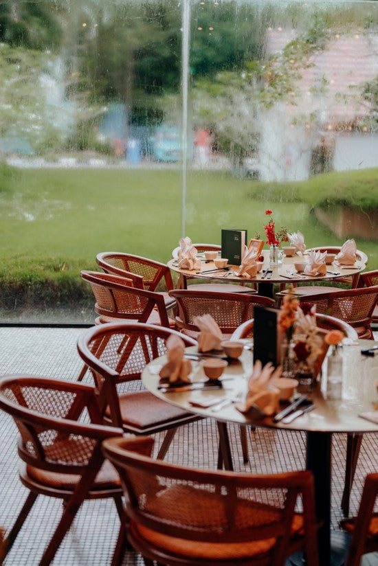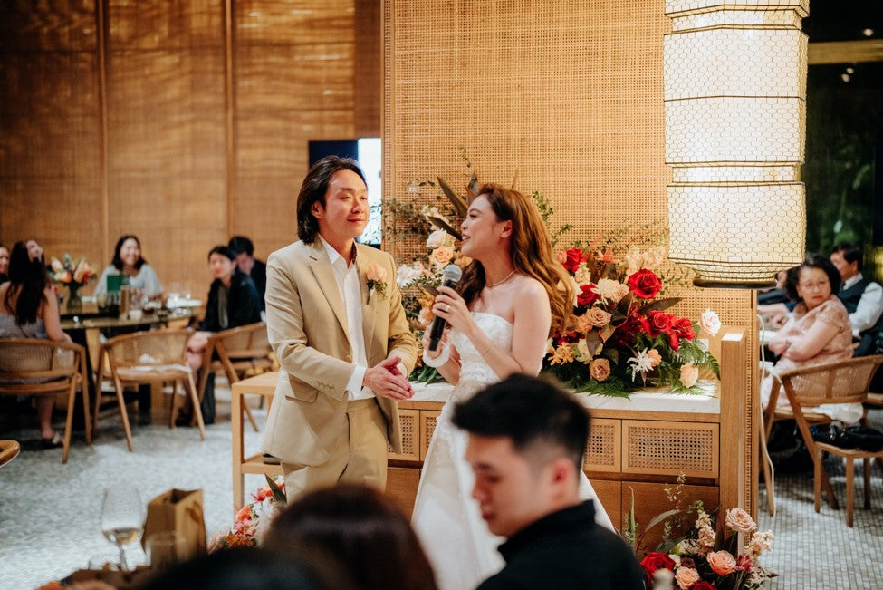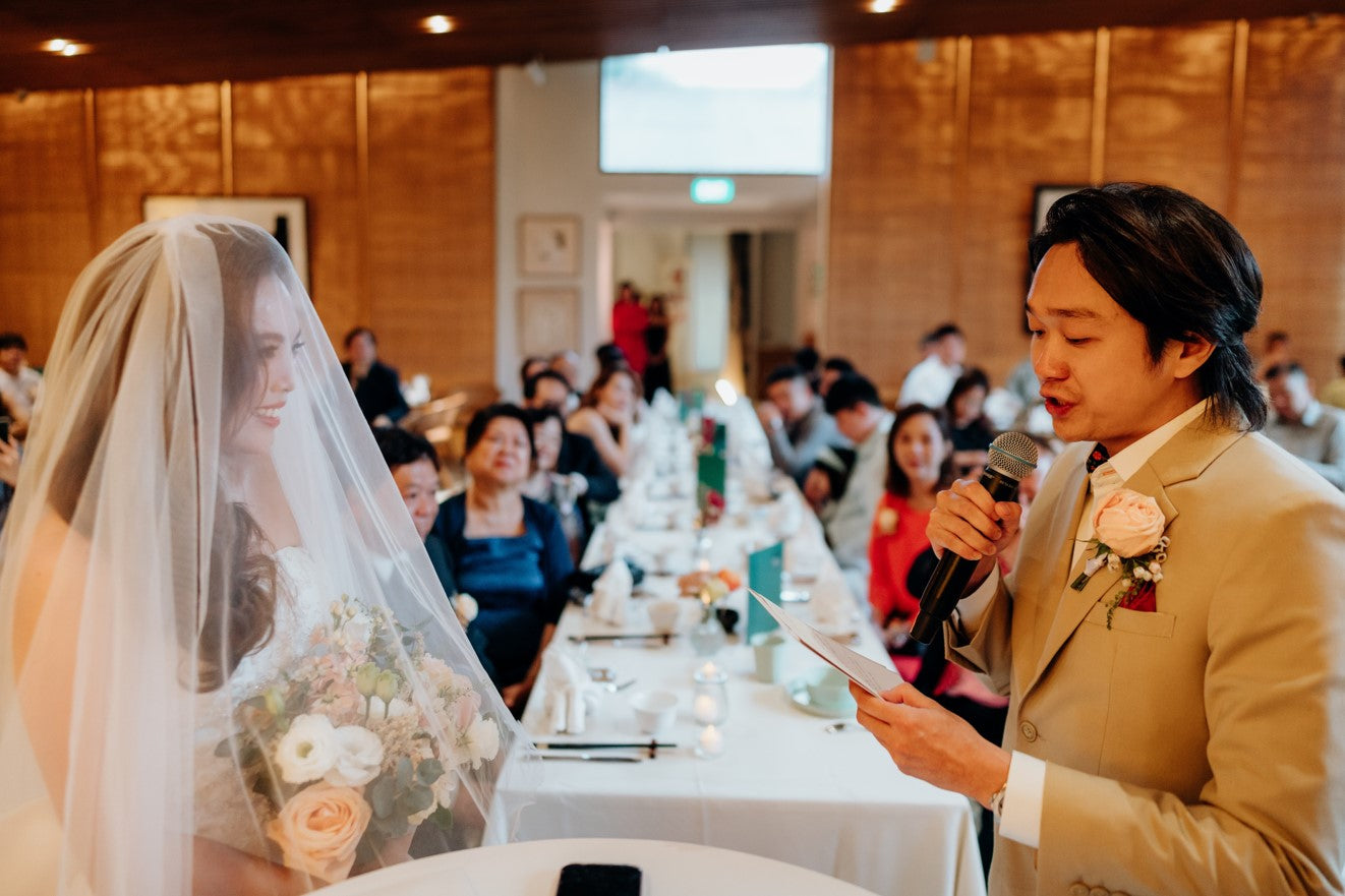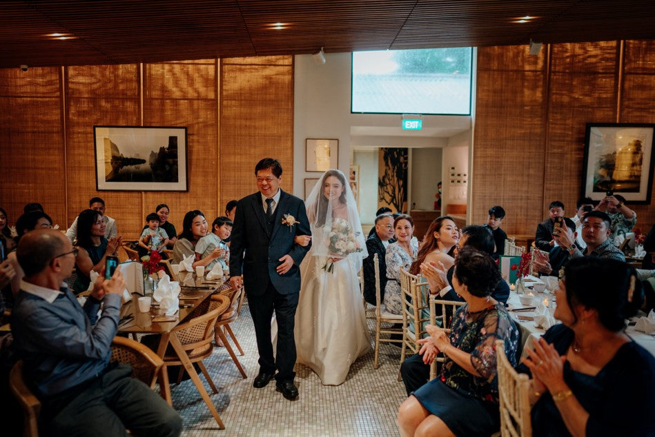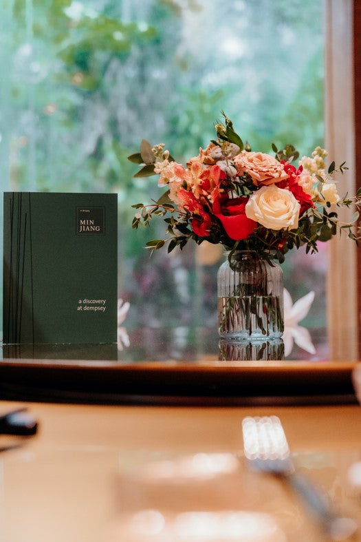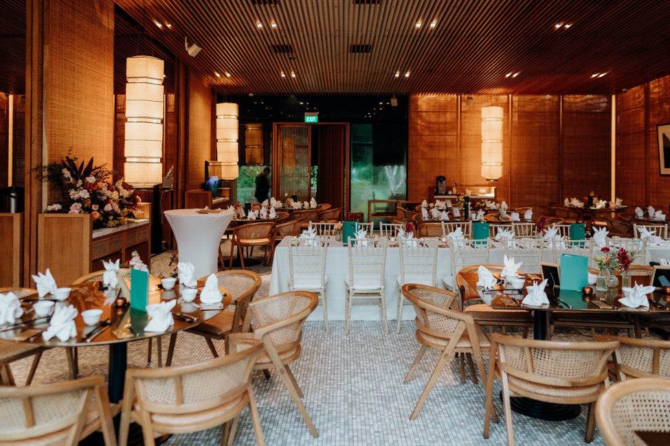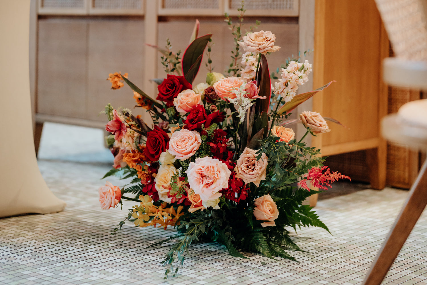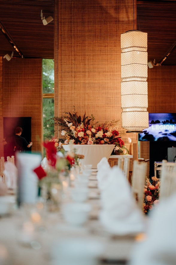 The selected colour palette for A & C's wedding dinner are inspired by autumn season, with a rich mix of reds, oranges and golds. The warm palette showcased through intricate floral guest table centrepieces and a statement flower creation positioned as a backdrop for the ceremony.