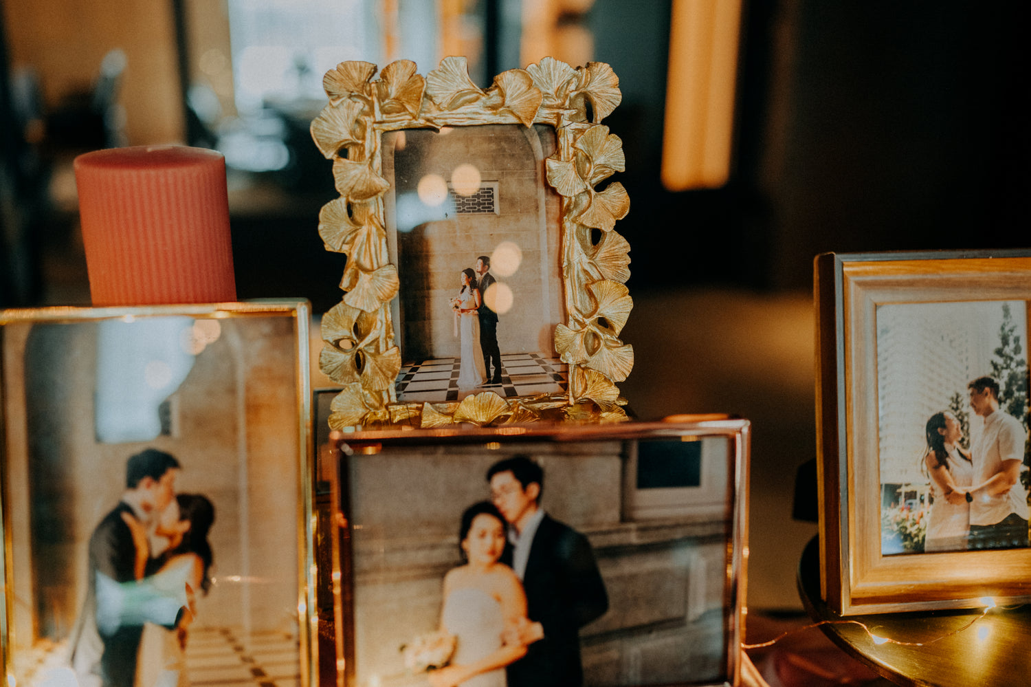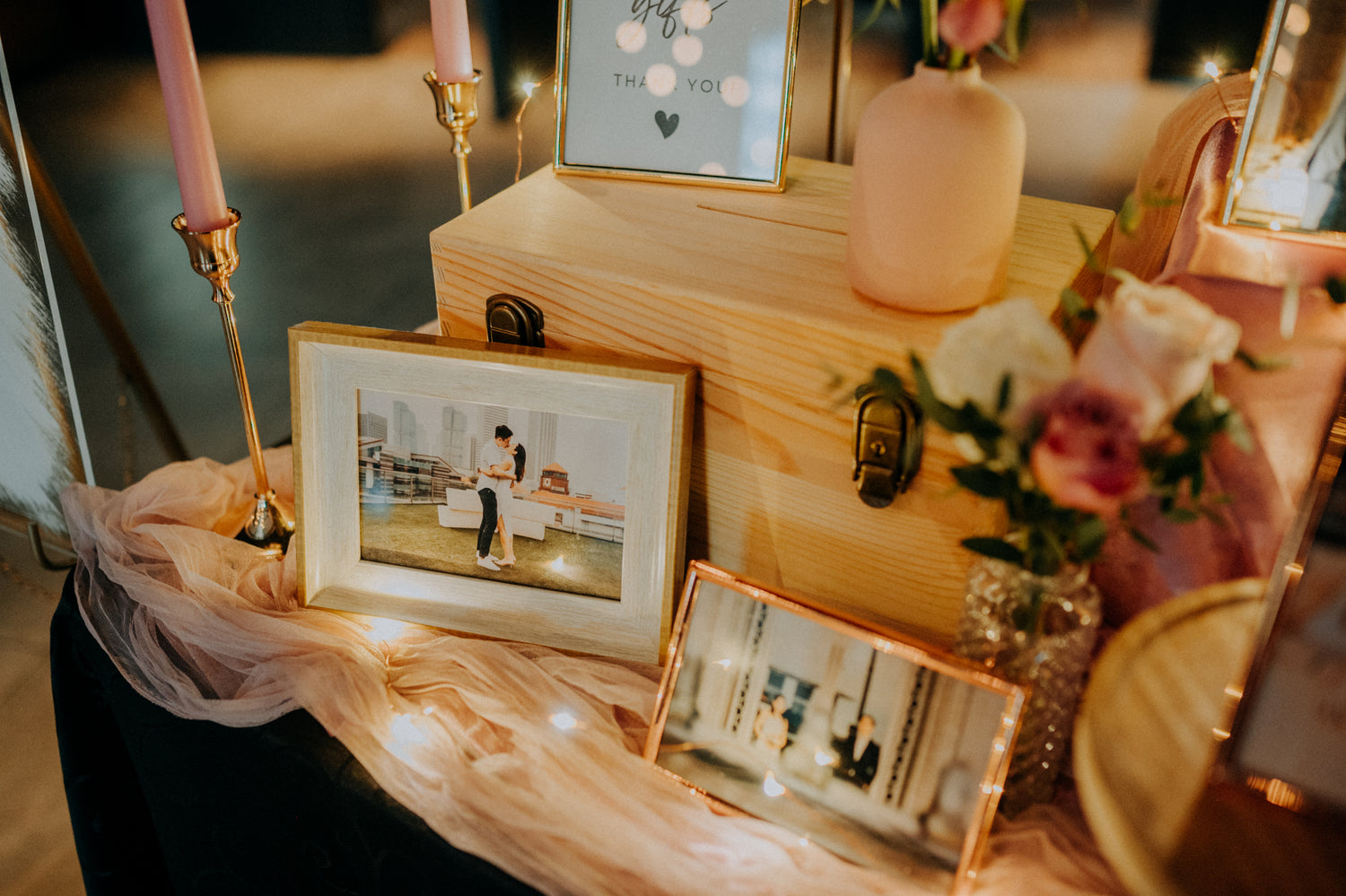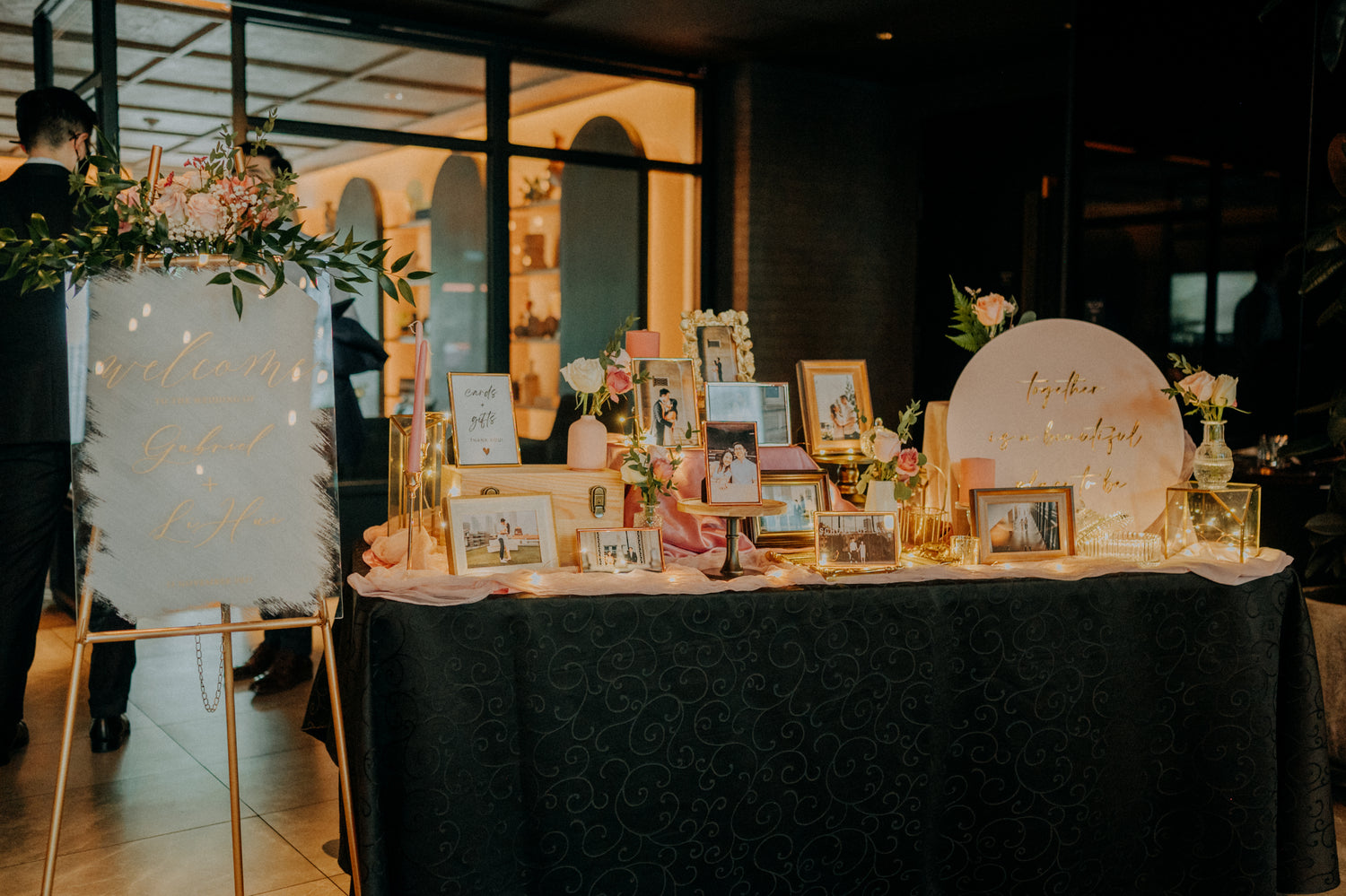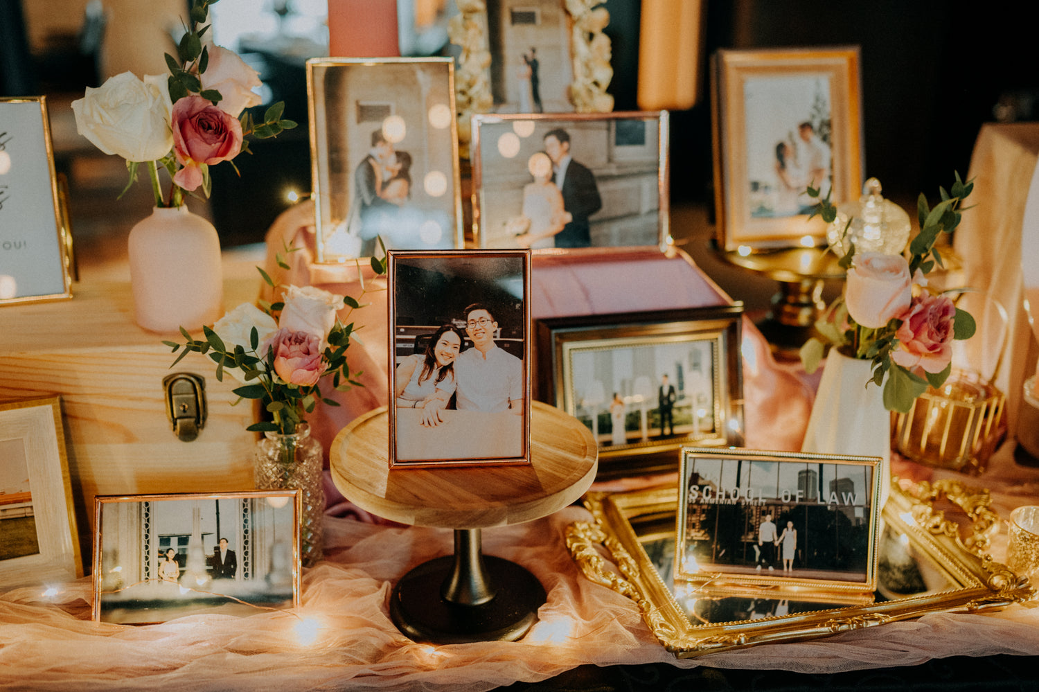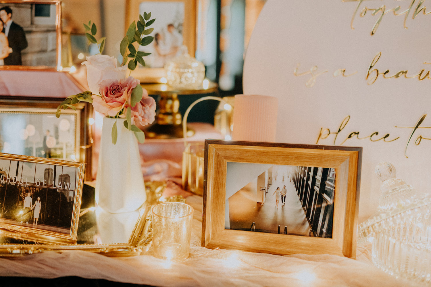 G & LH chose a beautiful space for their wedding reception at The Warehouse Hotel. This restored heritage building is uniquely fitted with chic industrial elements combined with its rich historic exposed ceiling and brickwork. We selected gold decor pieces to bring out that old-world glamour while softening it with blush roses and textured fabrics. This photo display table truly makes a statement for all guests arriving to G & LH's celebration of love.