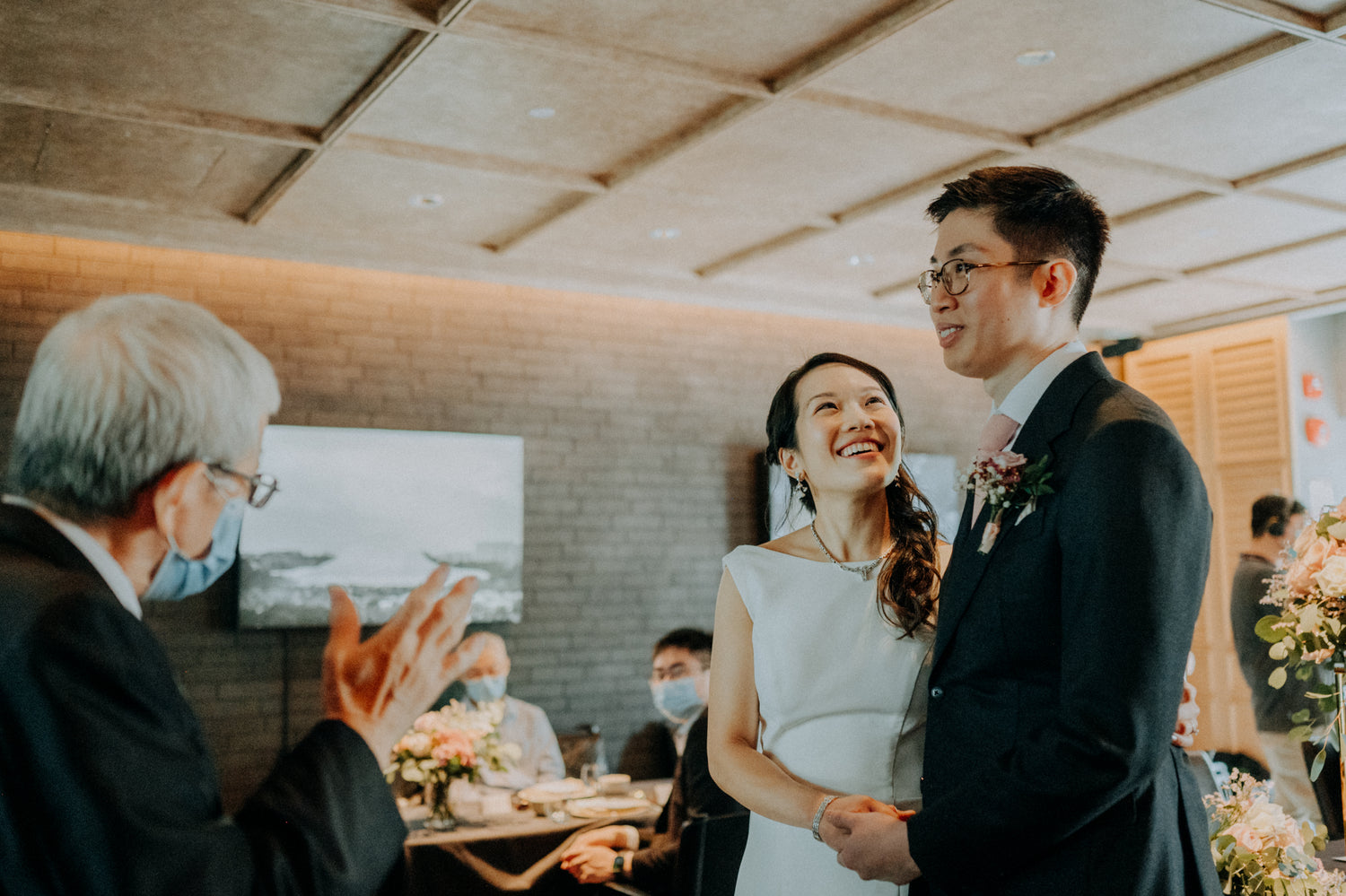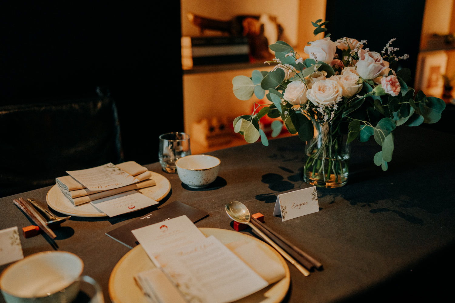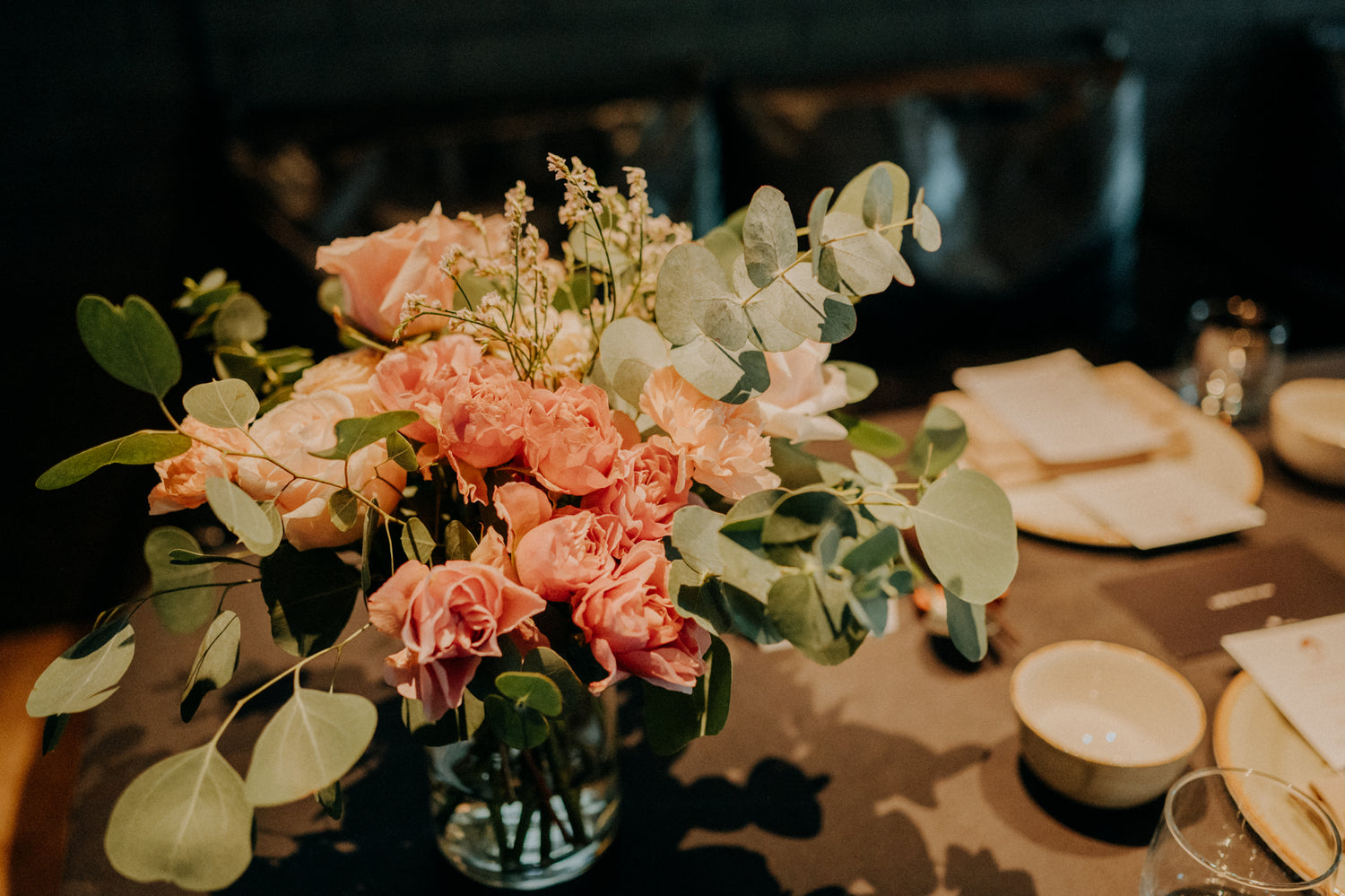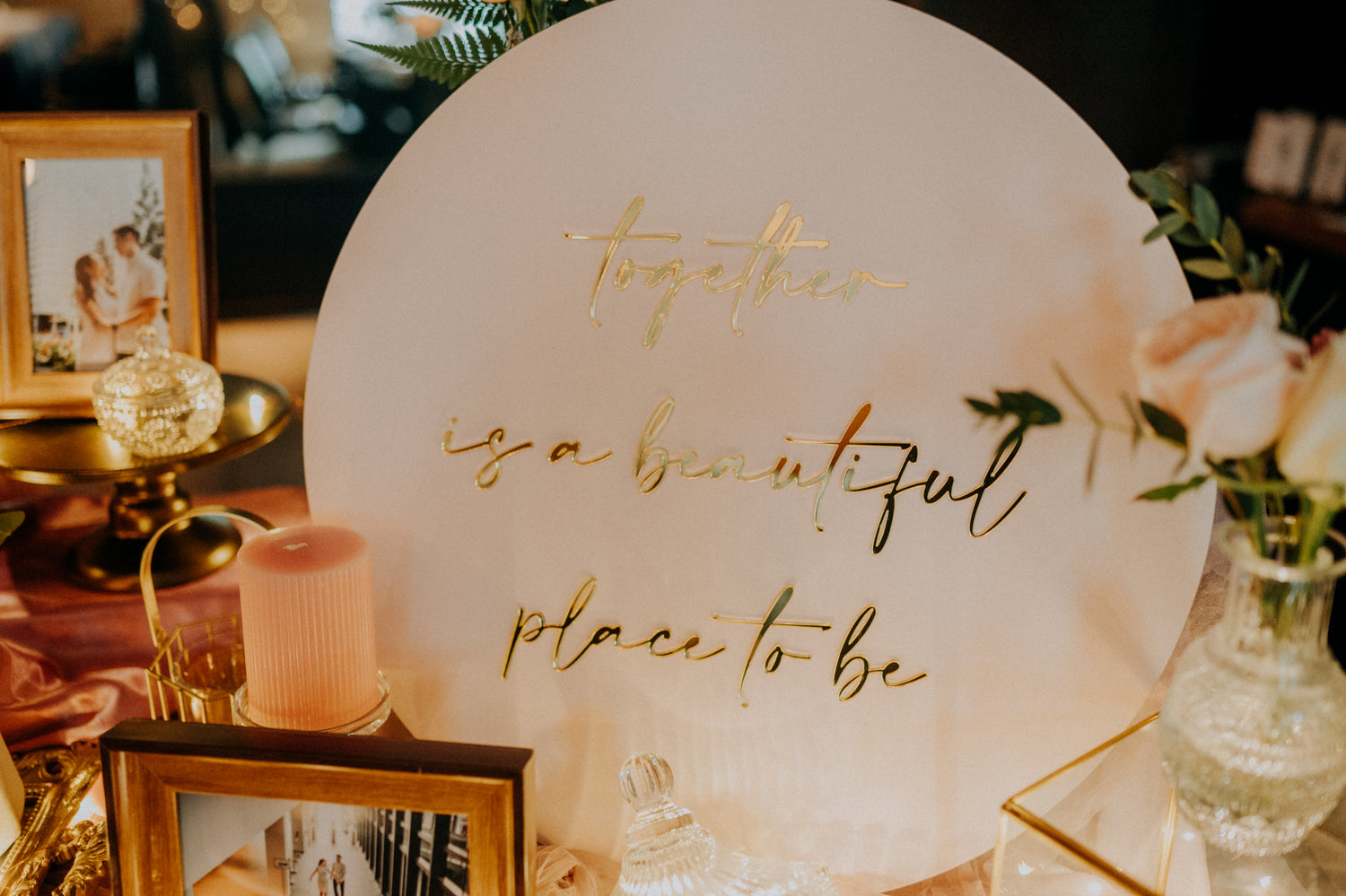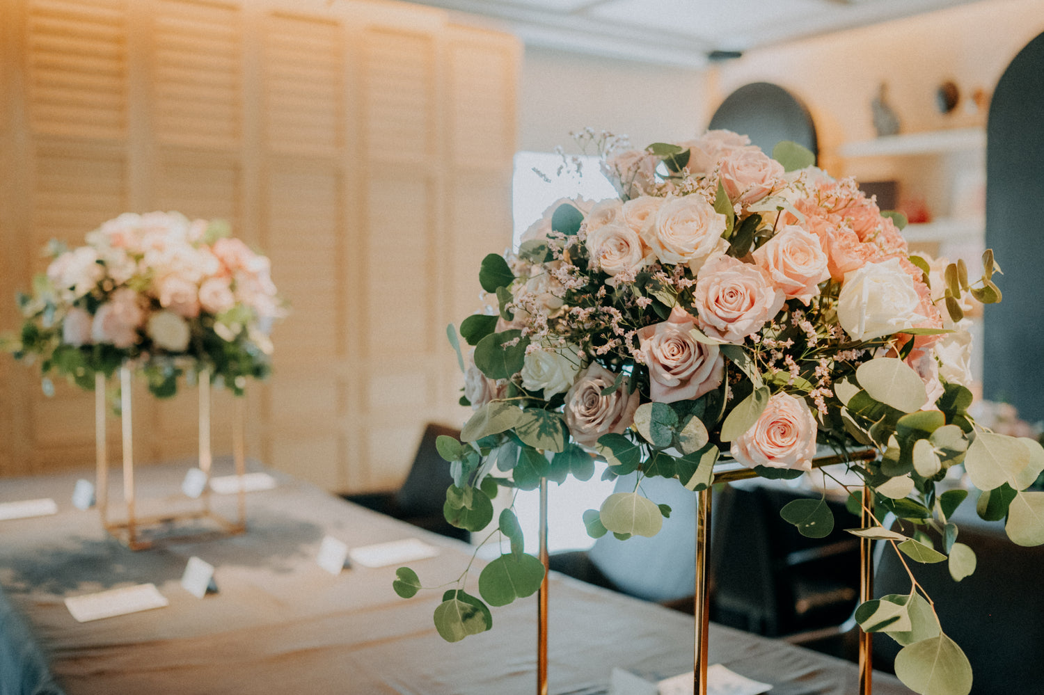G & LH chose a beautiful space for their wedding reception at The Warehouse Hotel. This restored heritage building is uniquely fitted with chic industrial elements combined with its rich historic exposed ceiling and brickwork. We selected gold decor pieces to bring out that old-world glamour while softening it with blush roses and textured fabrics. This photo display table truly makes a statement for all guests arriving to G & LH's celebration of love.
