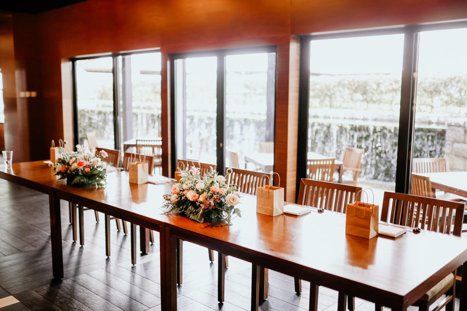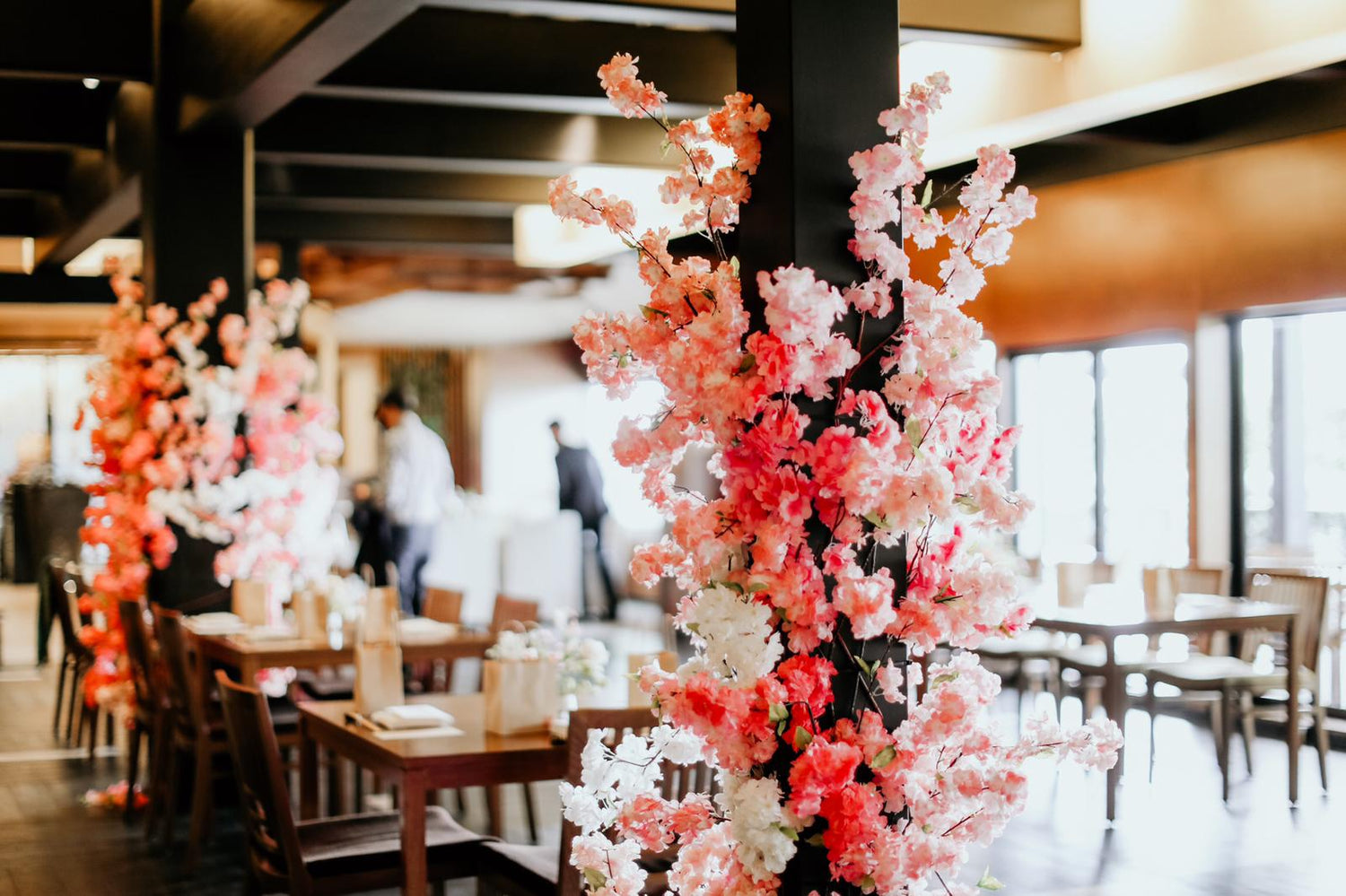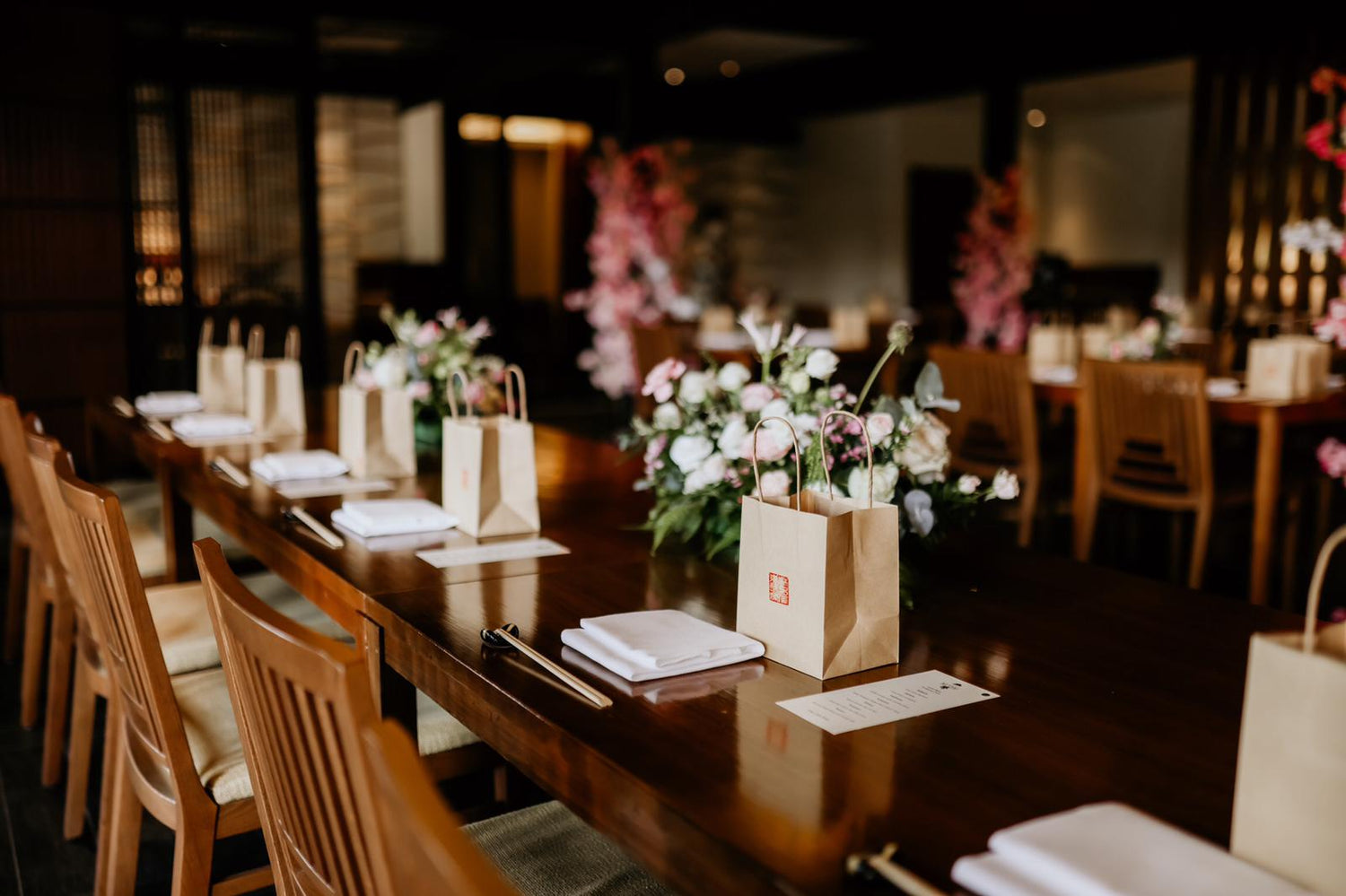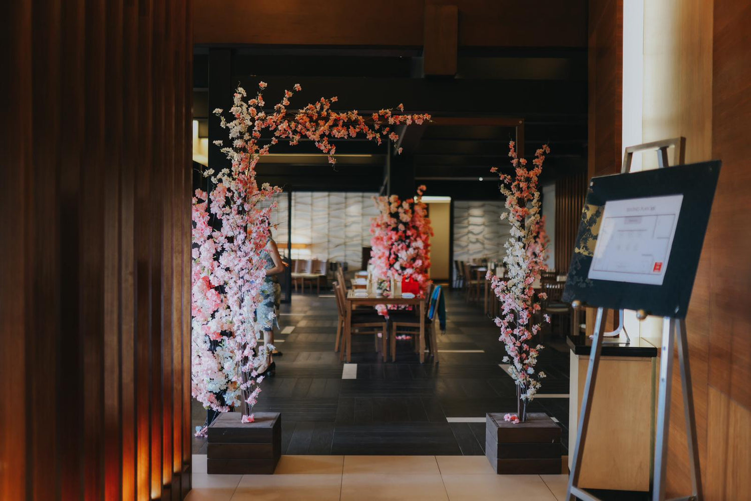Japanese heritage wed with a western modernity translated into this Sakura-filled wedding luncheon. An Ikebana floral centrepiece is featured on each guest table with lush Sakura blossoms. The mix of rich cherry shades blended beautifully with Keyaki's japanese-inspired interior.