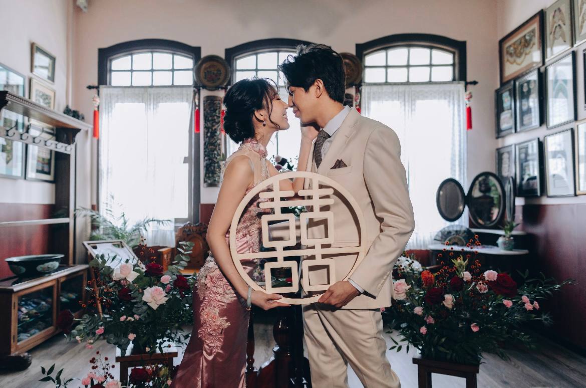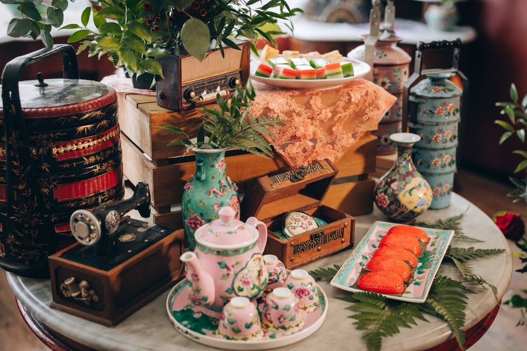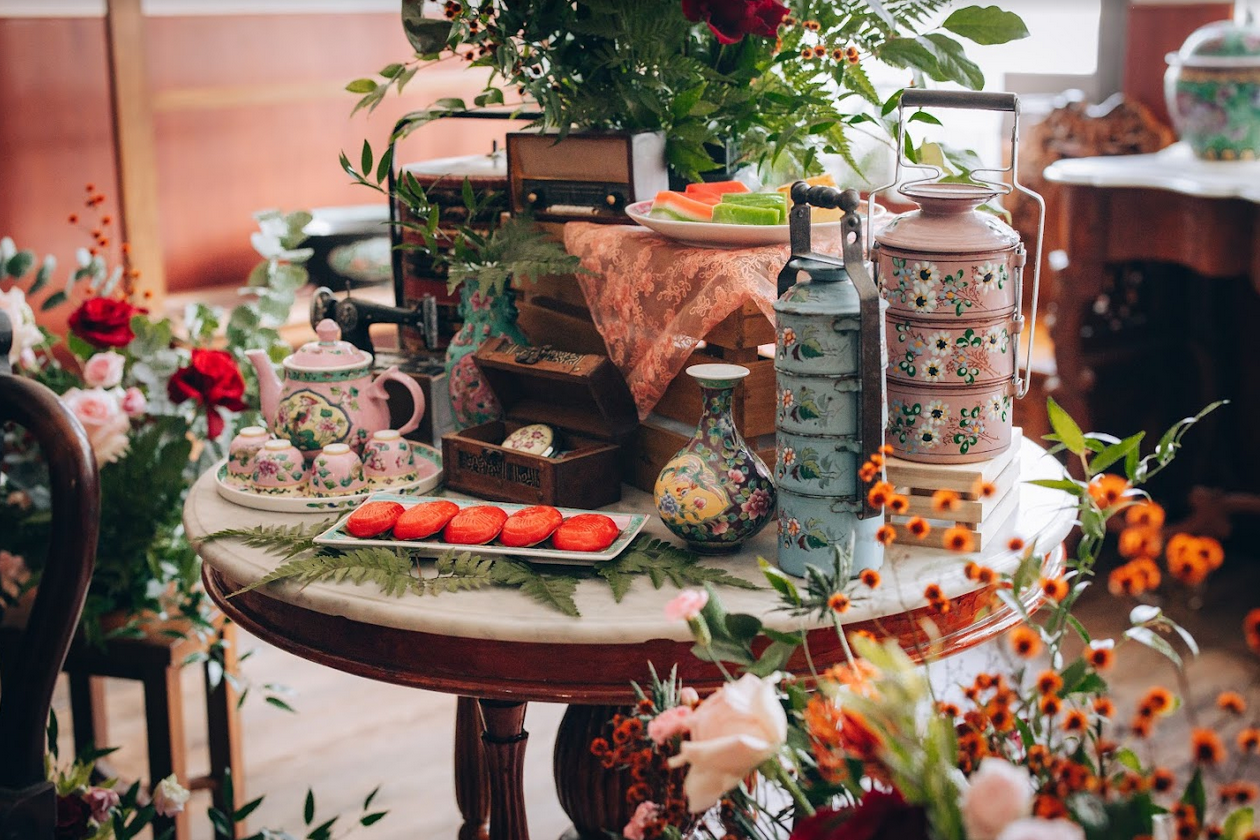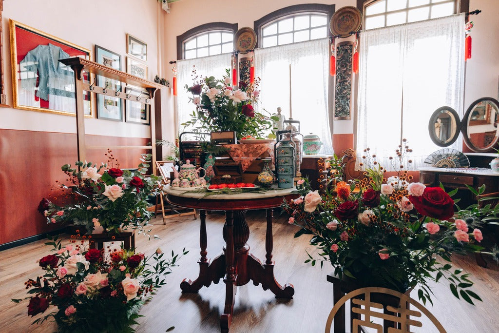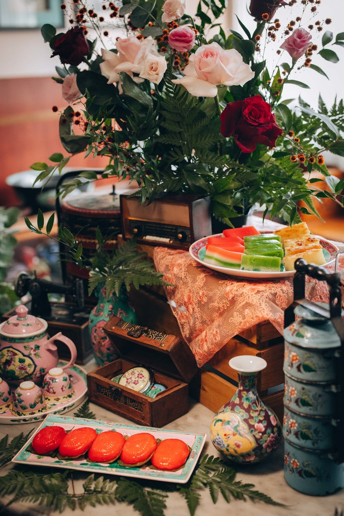 Styled a Peranakan themed prewedding shoot for Sean & Rachell at Kim Choo Kueh Chang's shophouse. Vintage tinkats, porcelain tea sets and wooden trinkets were the focus on this round table styling. The setup is completed with large floral installations in a bold red palette.