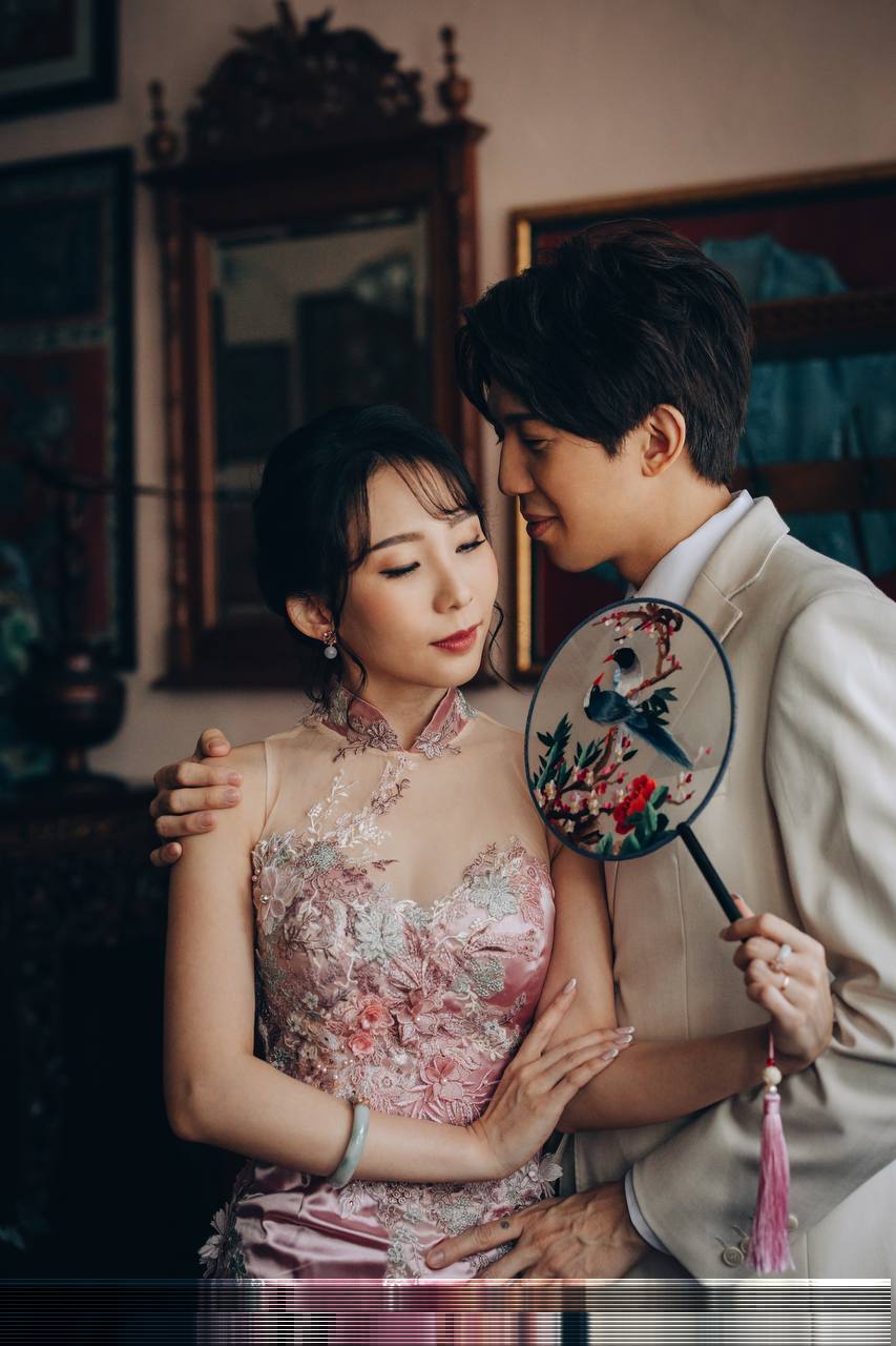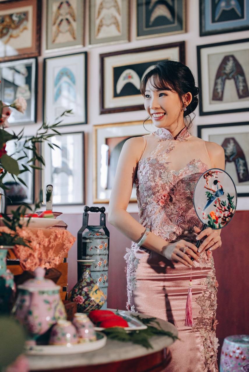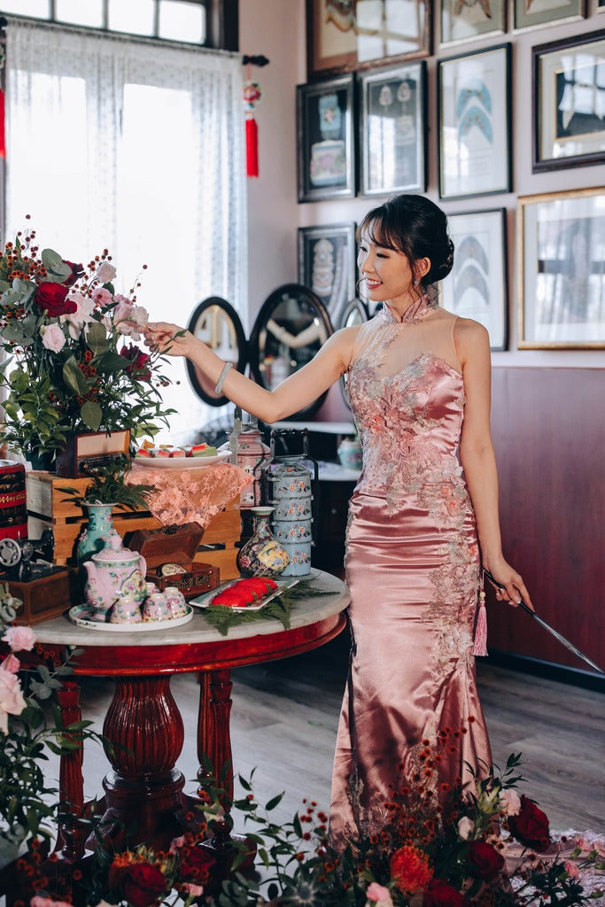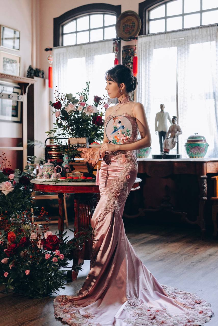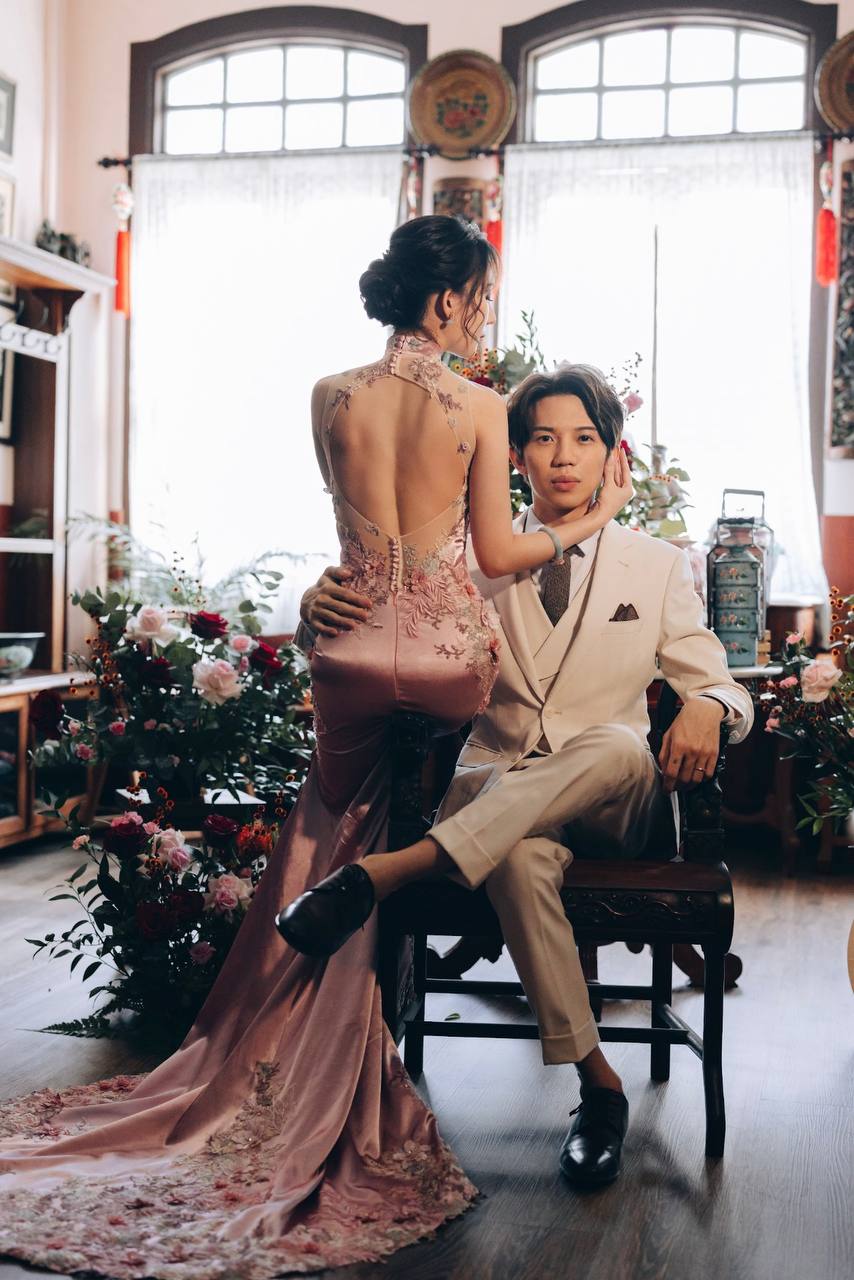 Styled a Peranakan themed prewedding shoot for Sean & Rachell at Kim Choo Kueh Chang's shophouse. Vintage tinkats, porcelain tea sets and wooden trinkets were the focus on this round table styling. The setup is completed with large floral installations in a bold red palette.