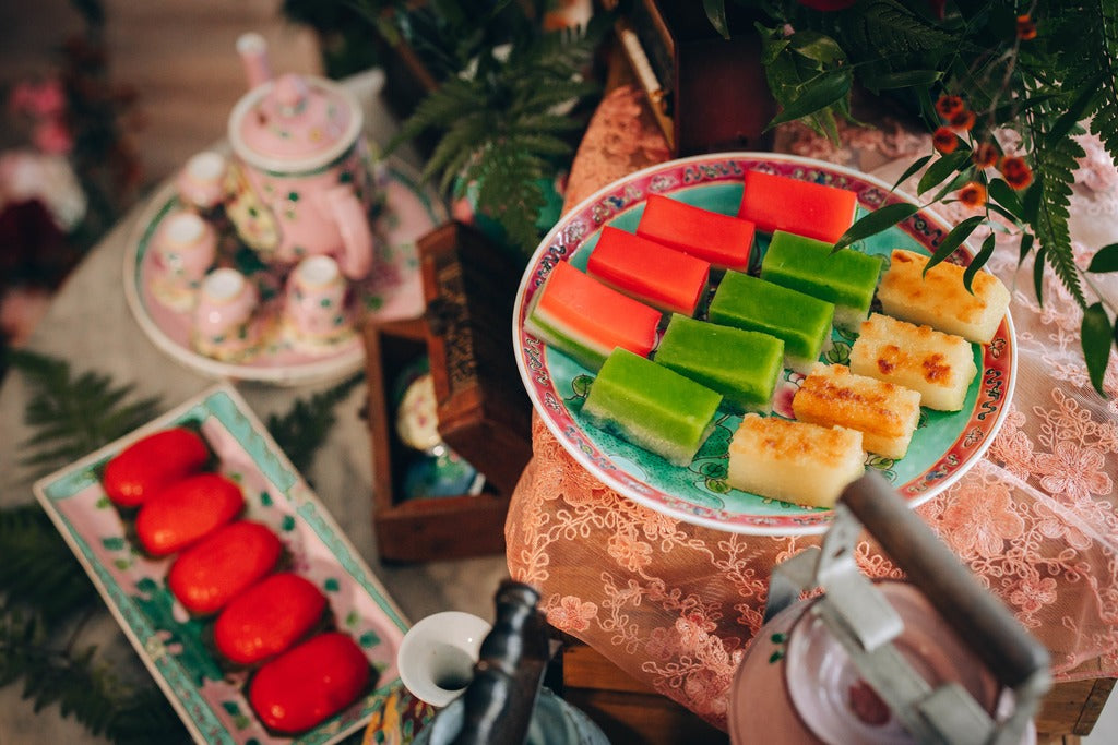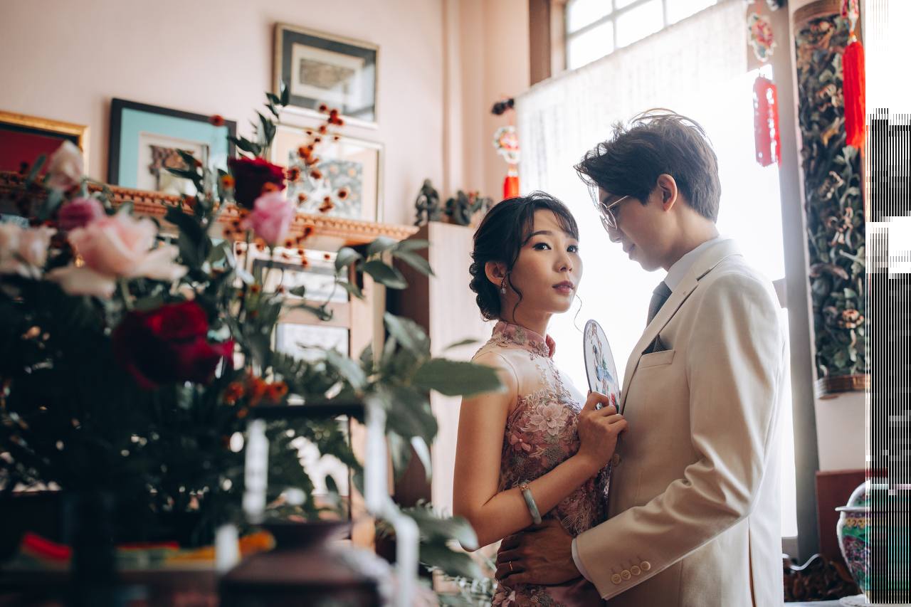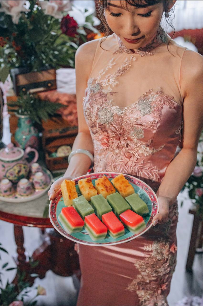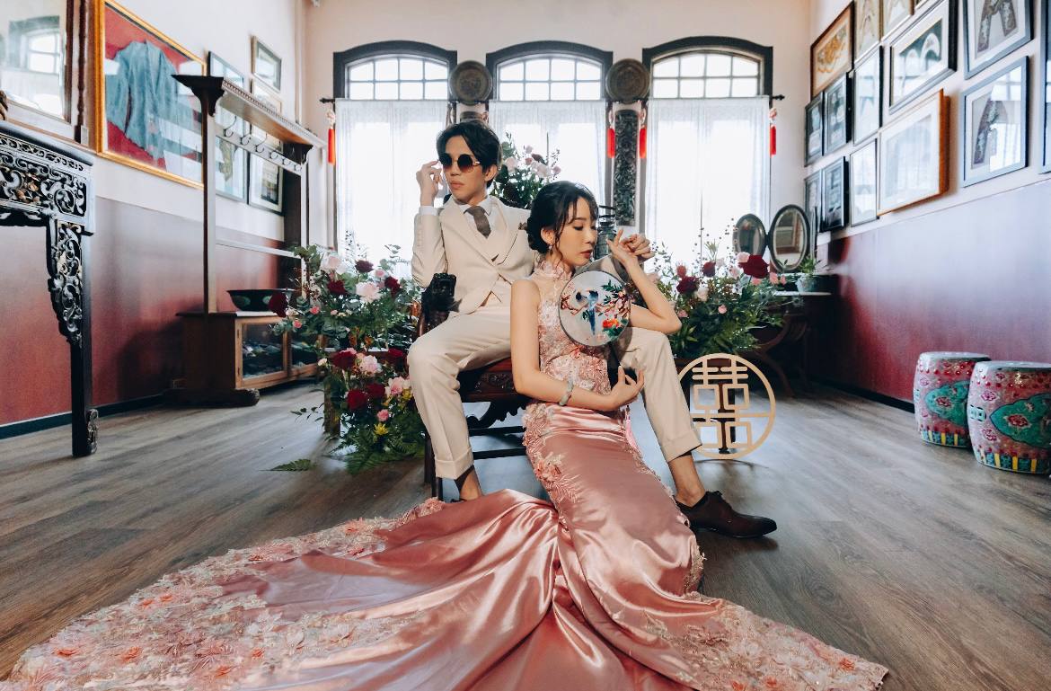 Styled a Peranakan themed prewedding shoot for Sean & Rachell at Kim Choo Kueh Chang's shophouse. Vintage tinkats, porcelain tea sets and wooden trinkets were the focus on this round table styling. The setup is completed with large floral installations in a bold red palette.