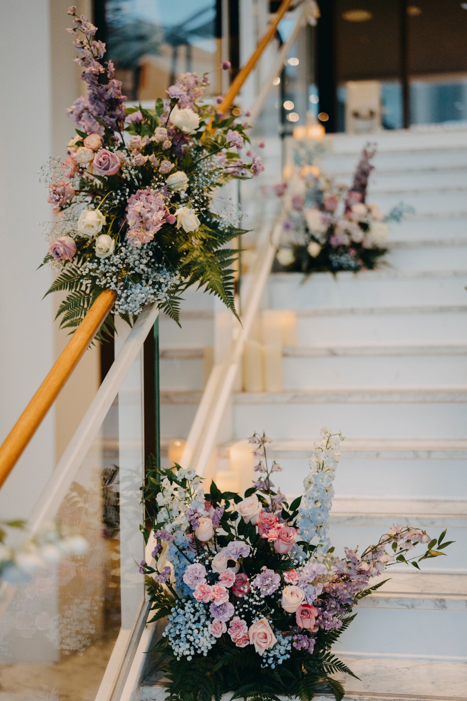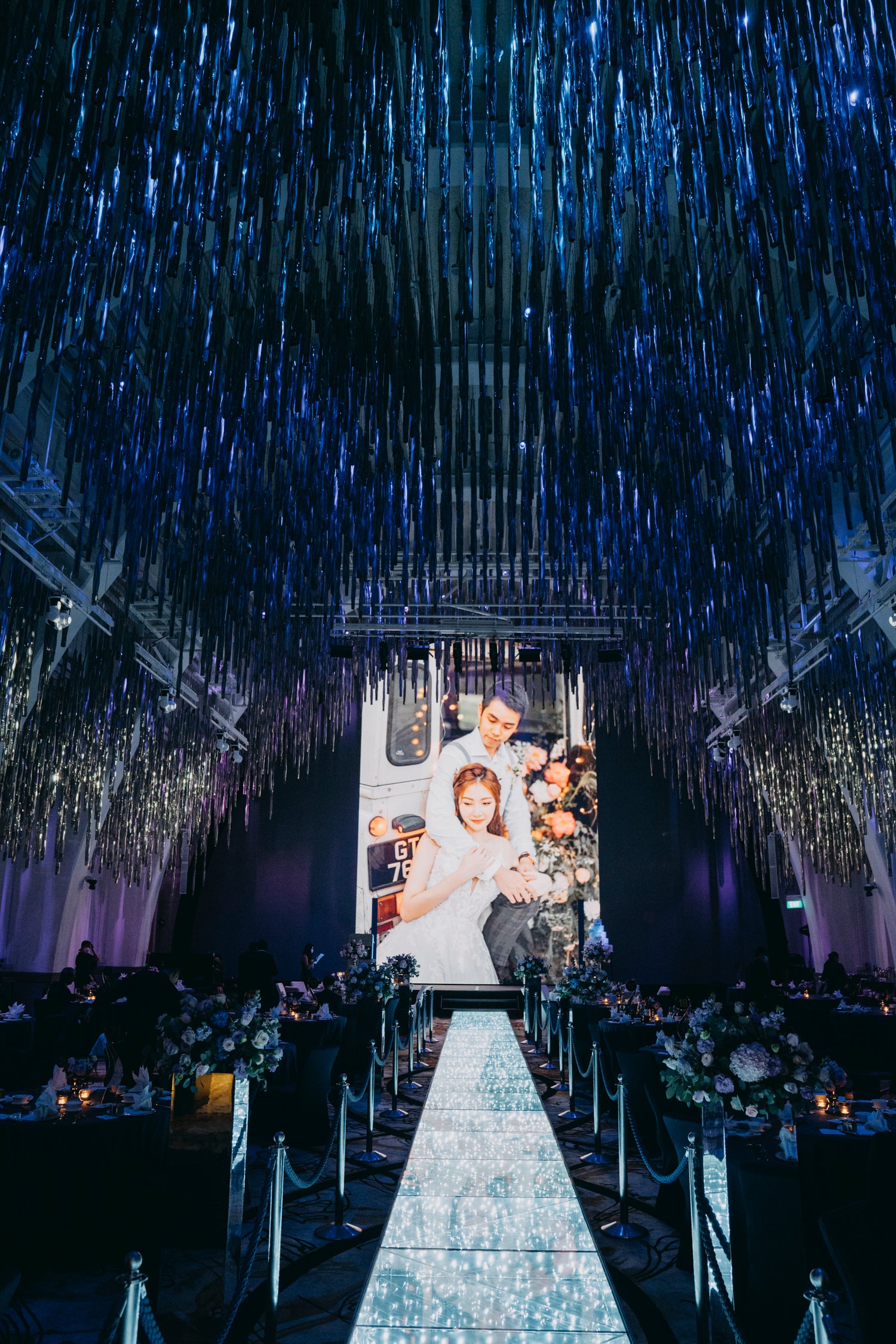 Fairytale wedding held at the glamorous JW Marriott Hotel, with a statement fairy lights aisle and jewel-toned fresh floral arrangements.