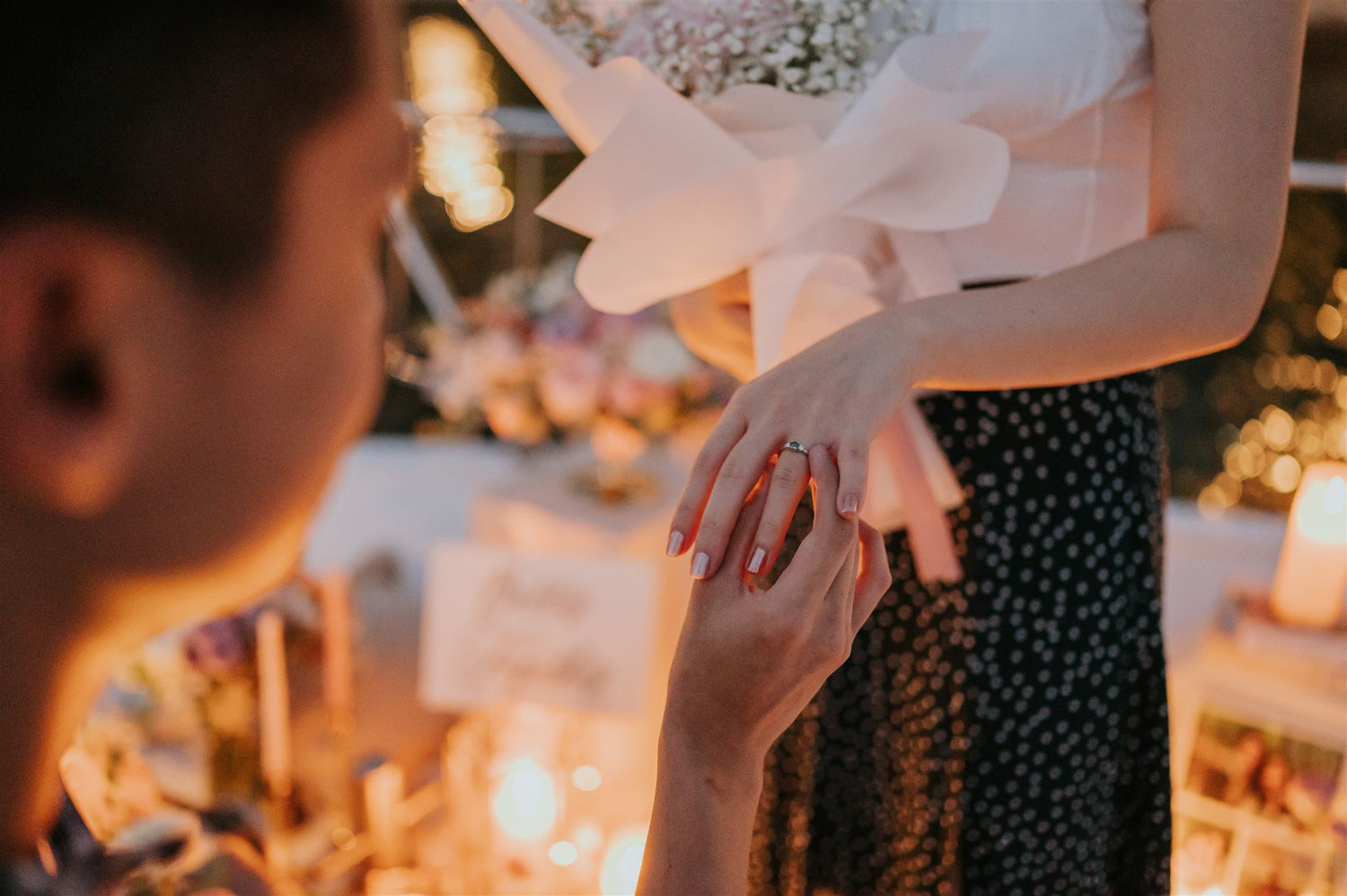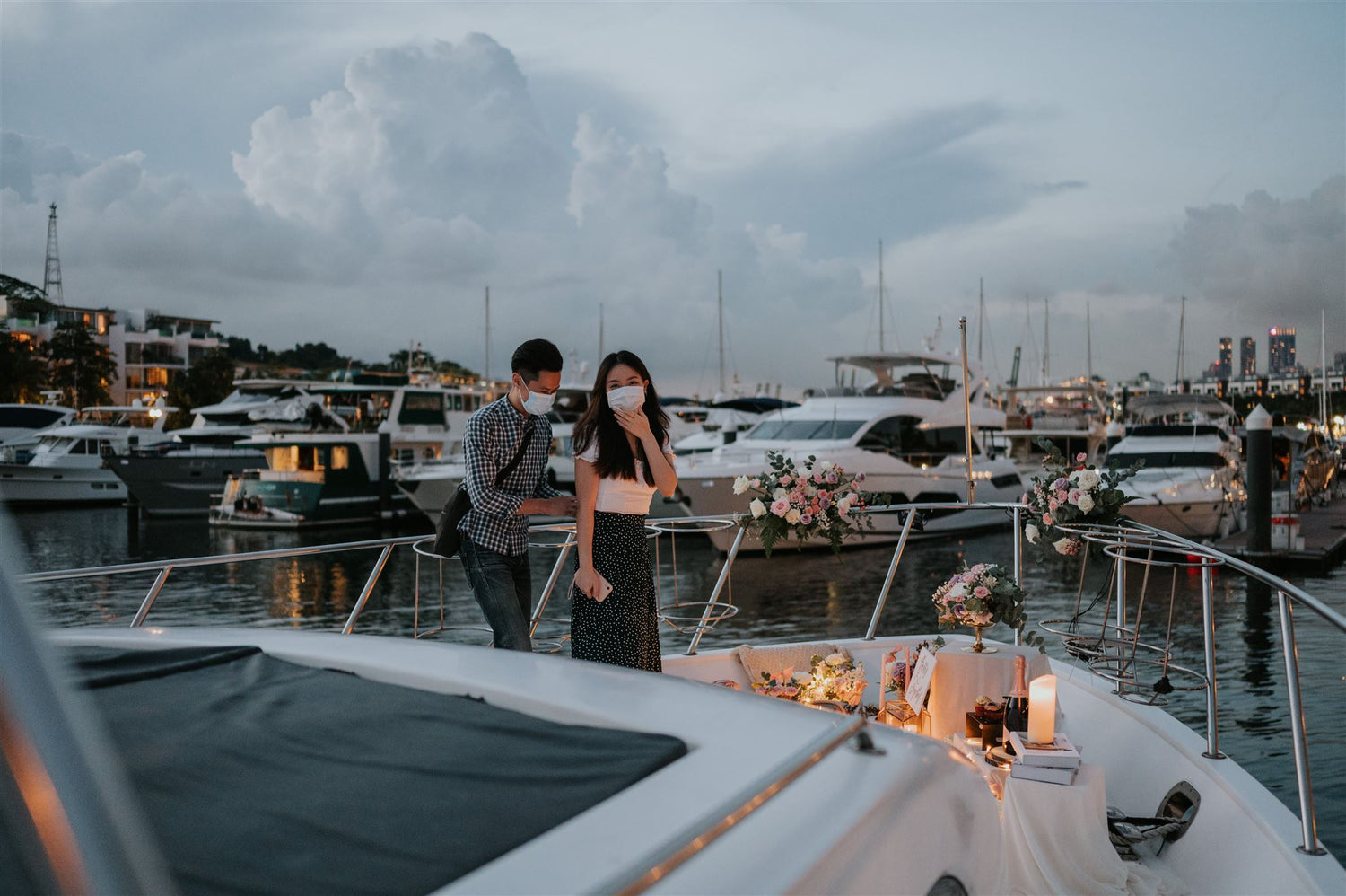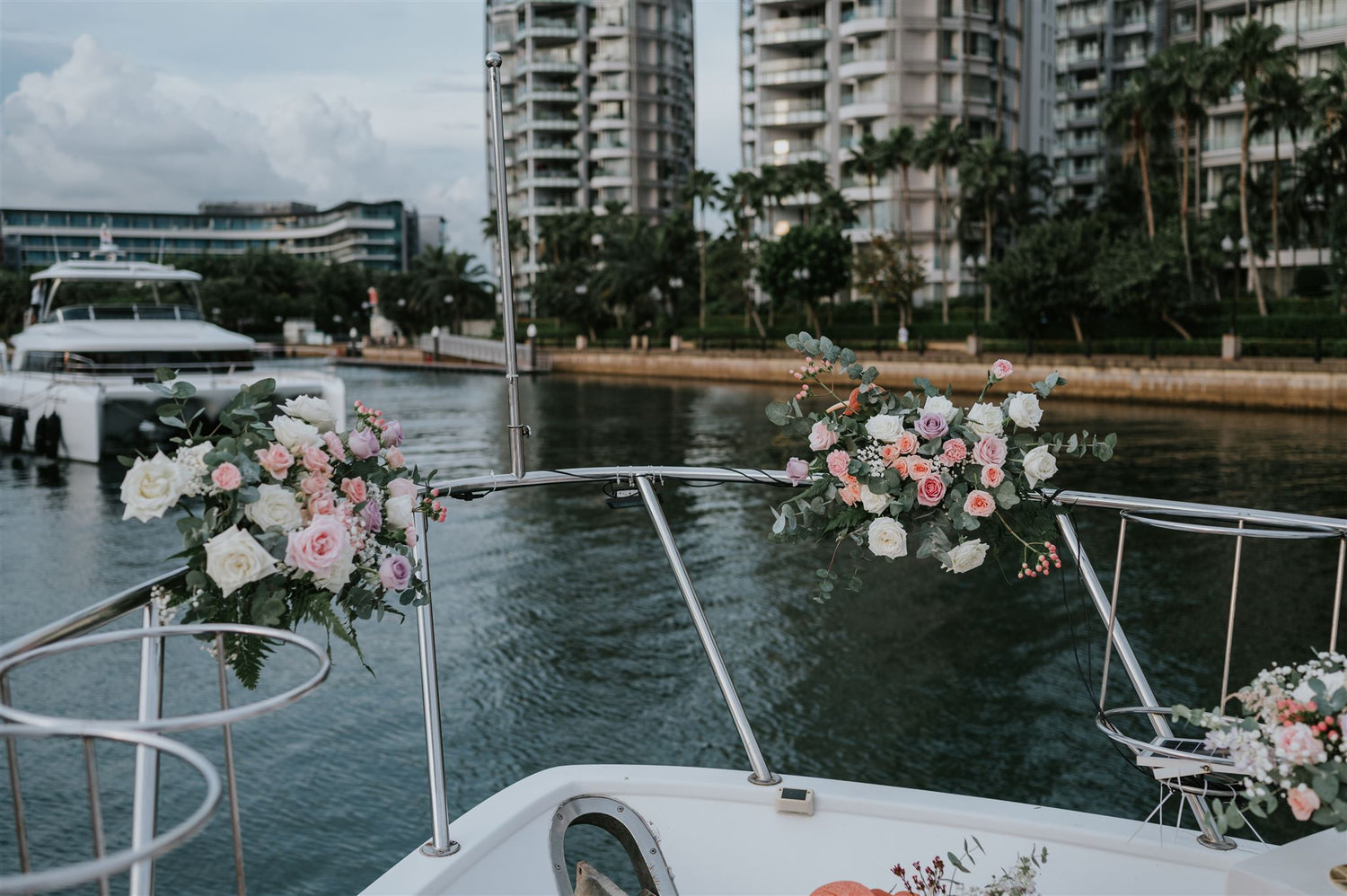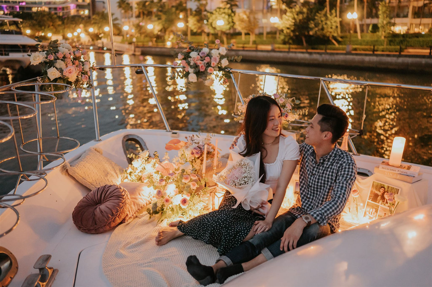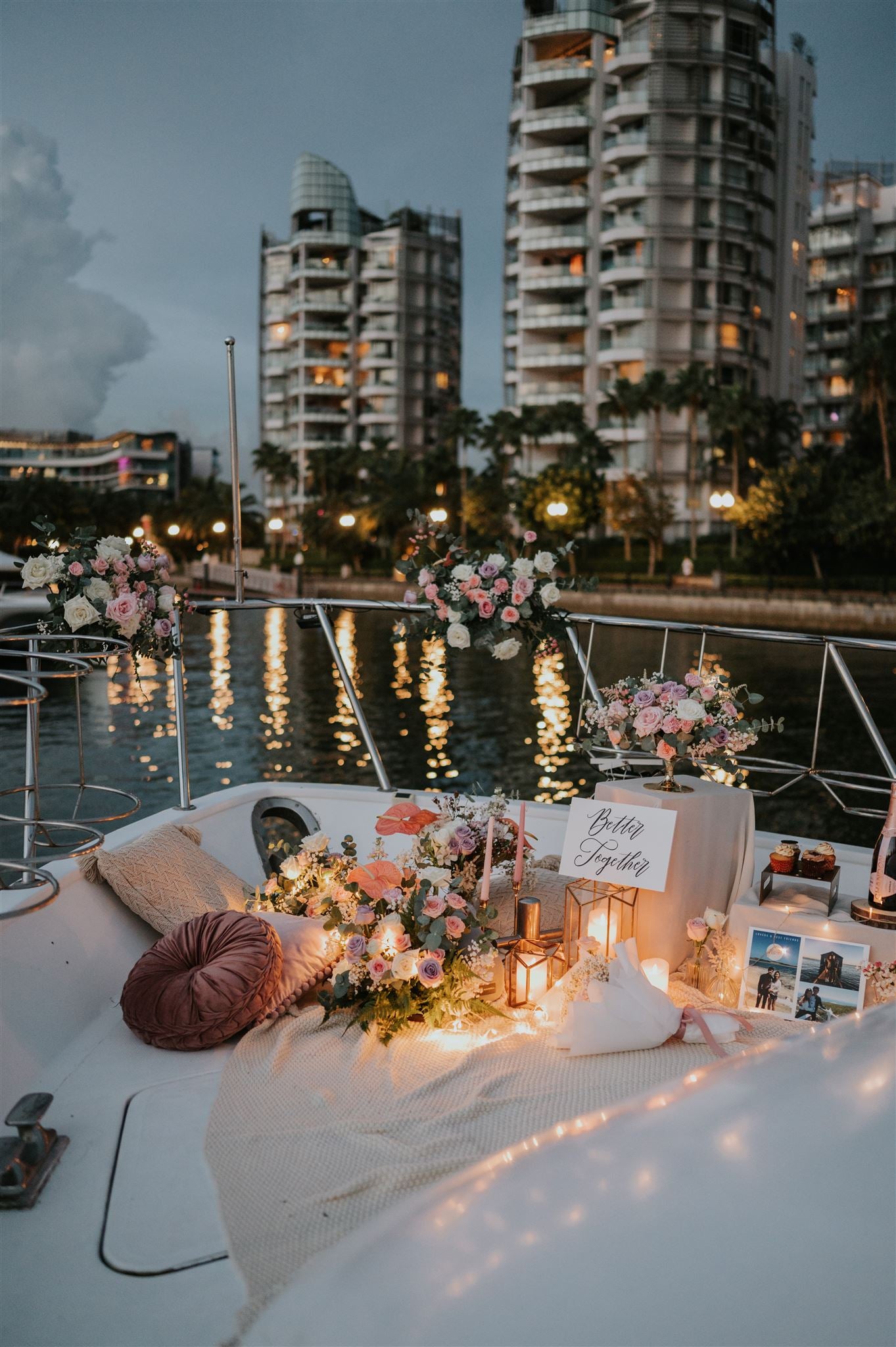 As this was an evening proposal onboard a yacht, we decided to go with warm candles and fairy lights to cast the most romantic glow upon this styled yacht proposal. The combination of ballerina pink, lilac and mauve only brought more romance to the overall aesthetic, creating the perfect dreamy mood for when she says Yes!