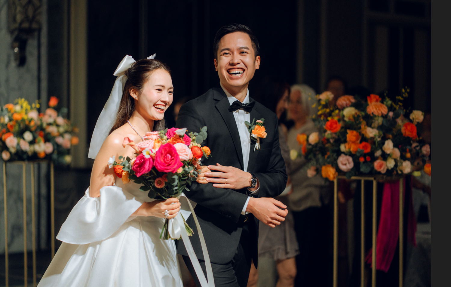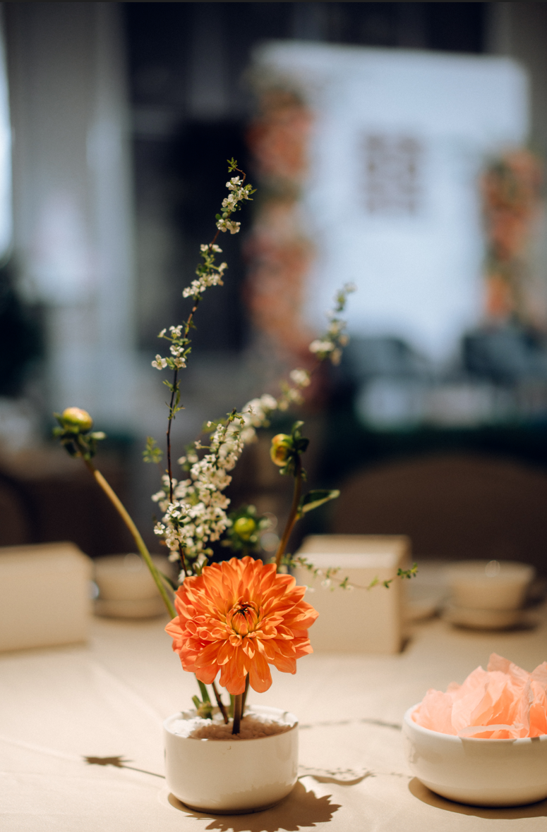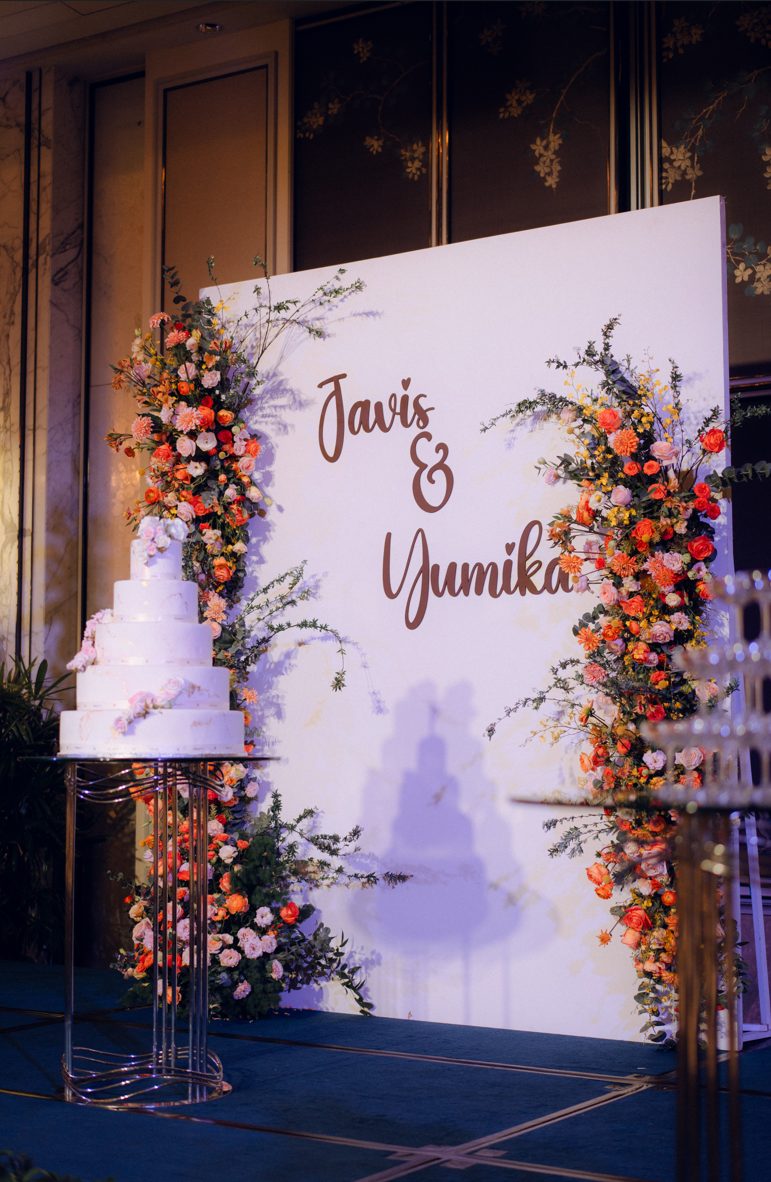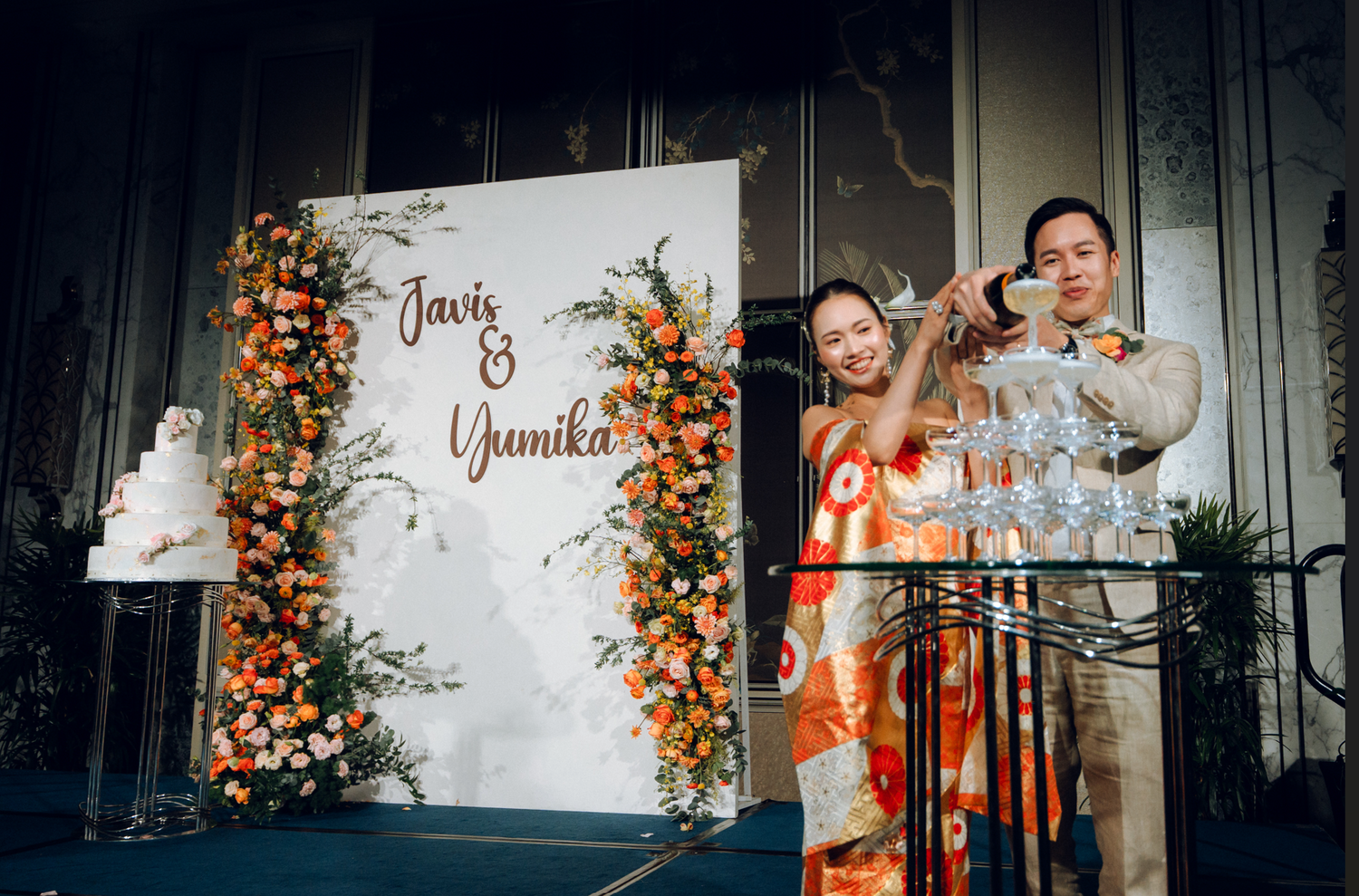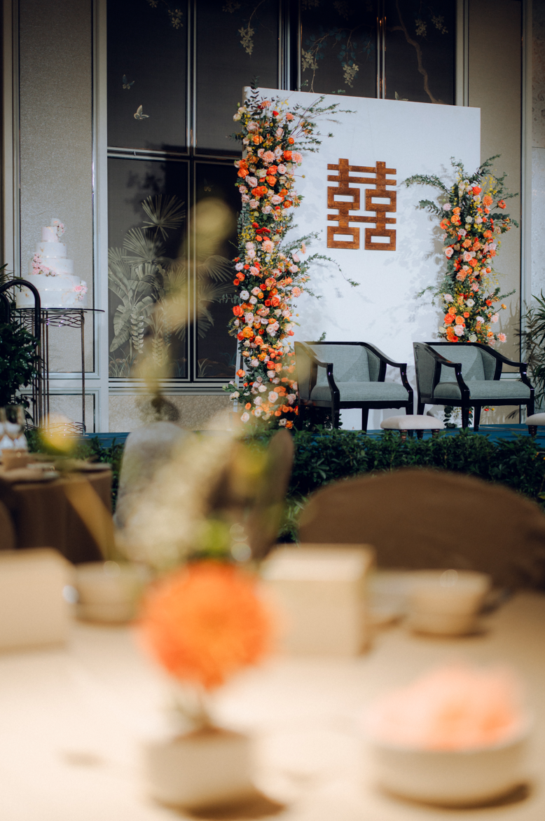 A wedding styled in bold sunset hues of radiant oranges and sunny yellows, incorporated into table centrepieces, stage backdrop and every fresh floral arrangement at Y & J's Shangri-La Hotel wedding.