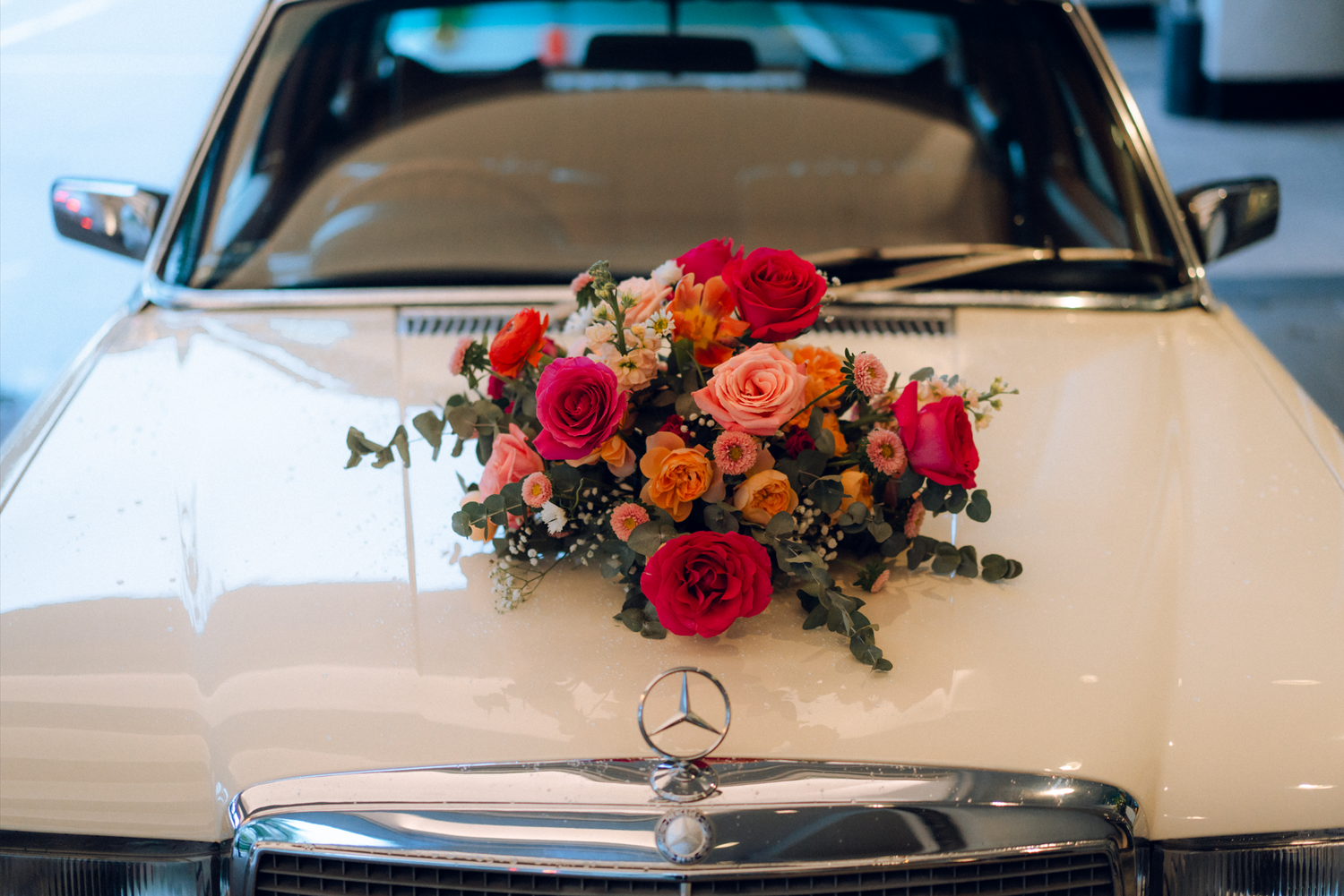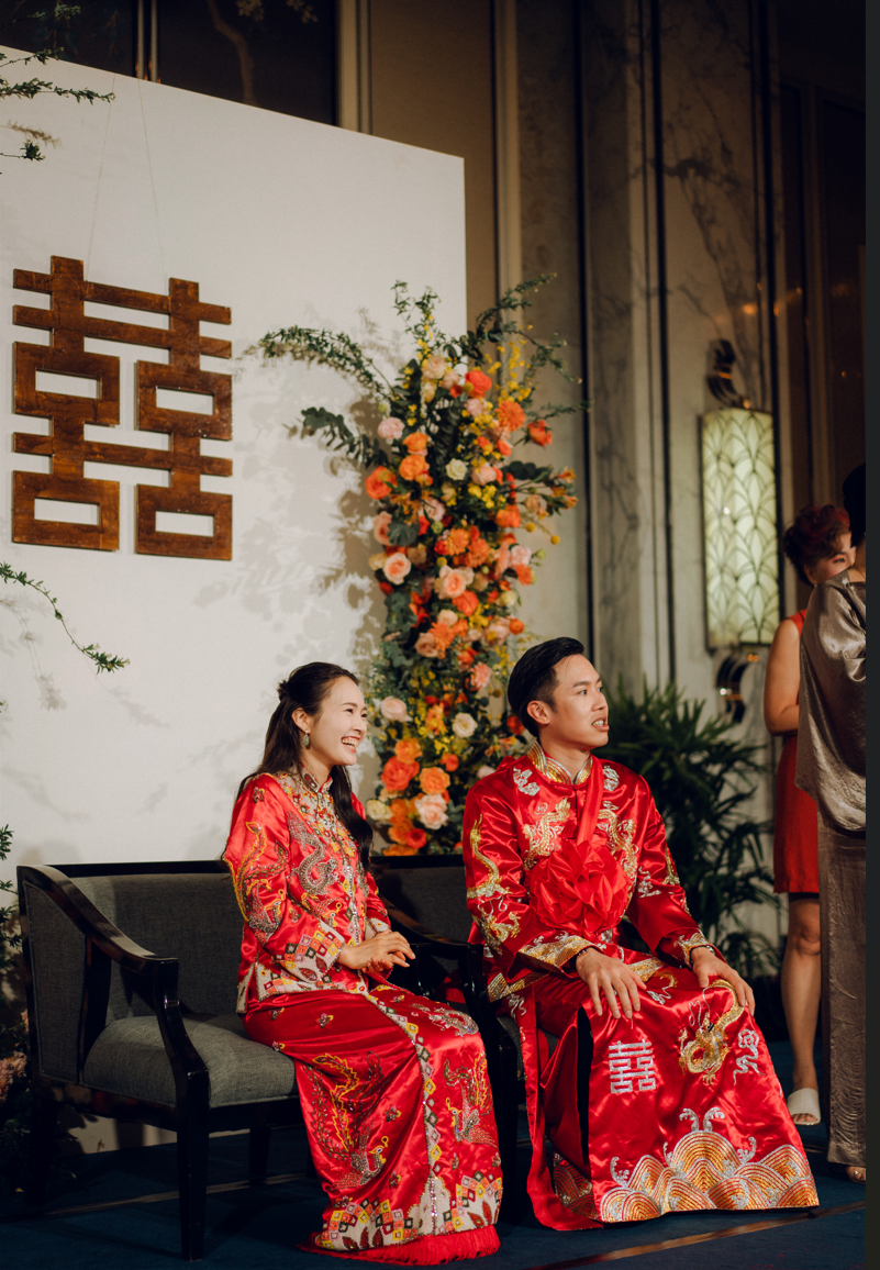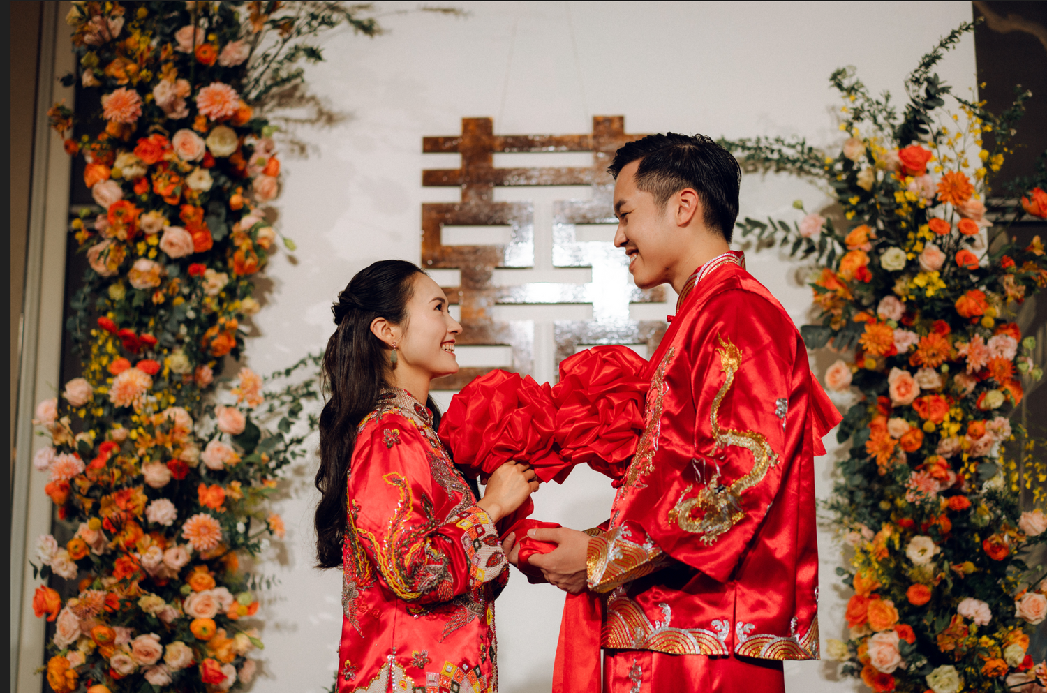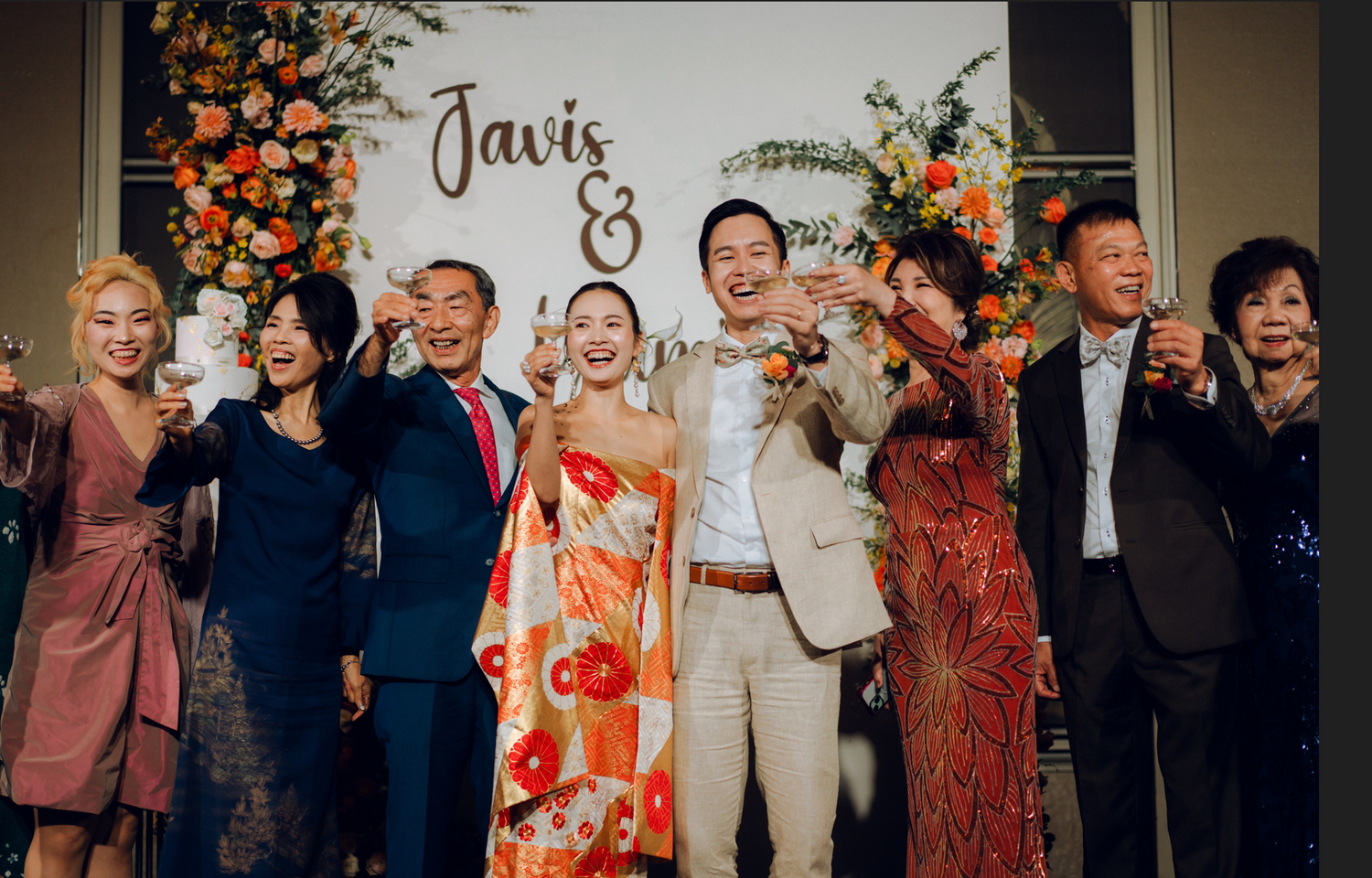 A wedding styled in bold sunset hues of radiant oranges and sunny yellows, incorporated into table centrepieces, stage backdrop and every fresh floral arrangement at Y & J's Shangri-La Hotel wedding.