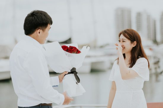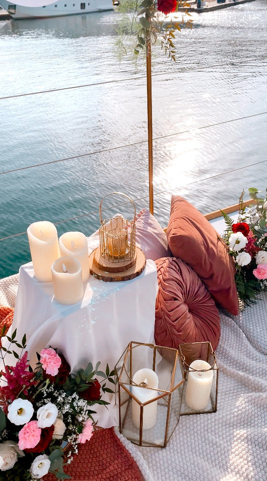 This luxurious vessel is perfect for intimate photoshoots, proposals, anniversaries & wedding ceremonies. There are two distinct spaces onboard the 47ft Catamaran. The forward deck brings an incredible vast space to host an intimate solemnisation and a comfortable second forward cockpit that can sit guests while offering unblocked views of the endless sea. We suggest keeping to about 12 guests for everyone to comfortably gather within the yacht space. We recommend taking full advantage of the exposed yacht railings for floral posies to create that perfect wedding shot. You could personalise these florals according to your vision, be it clean and minimalist, or lush and cascading arrangements complemented with ground hedges. For proposals, we would suggest a cosy look with textured cushions, a mini display of your favourite memories, with a classic rose bouquet.
